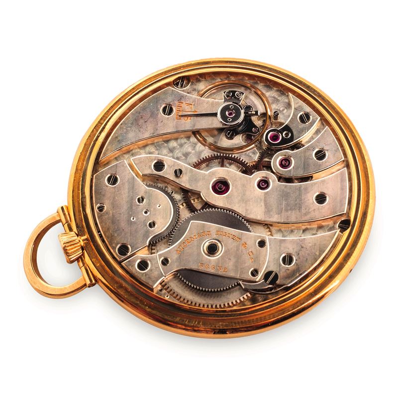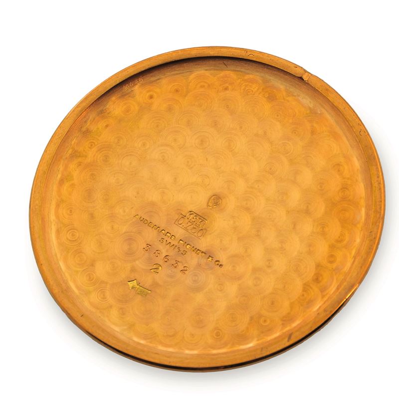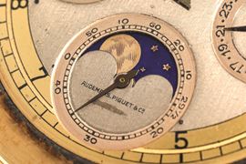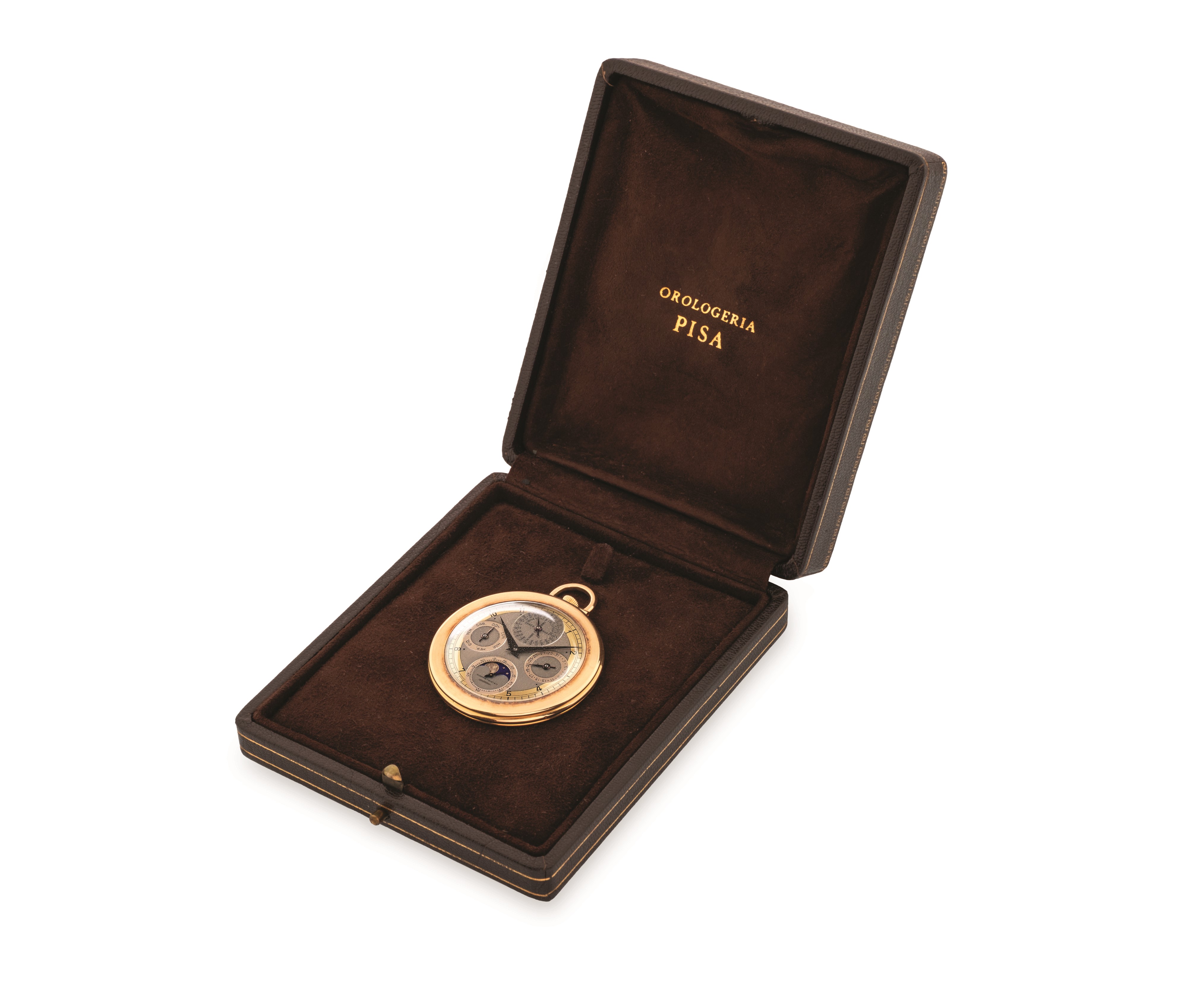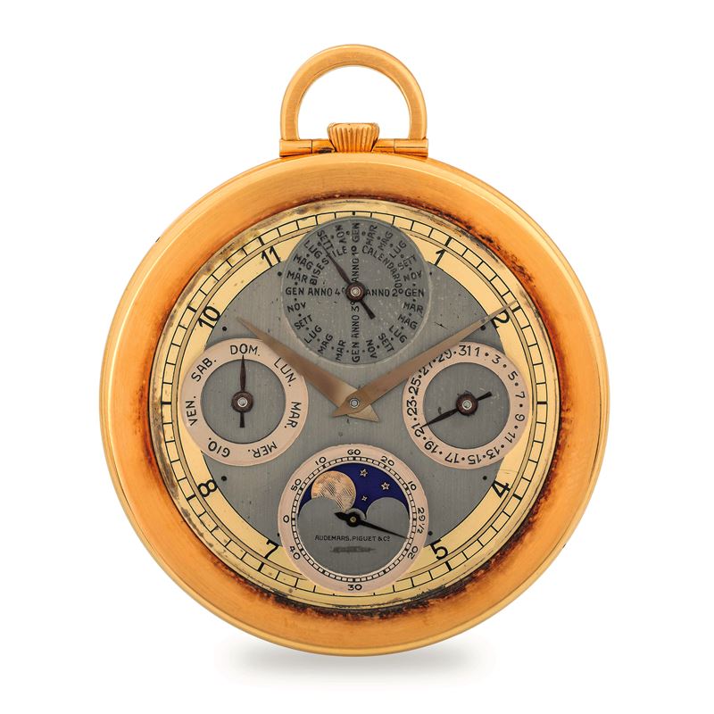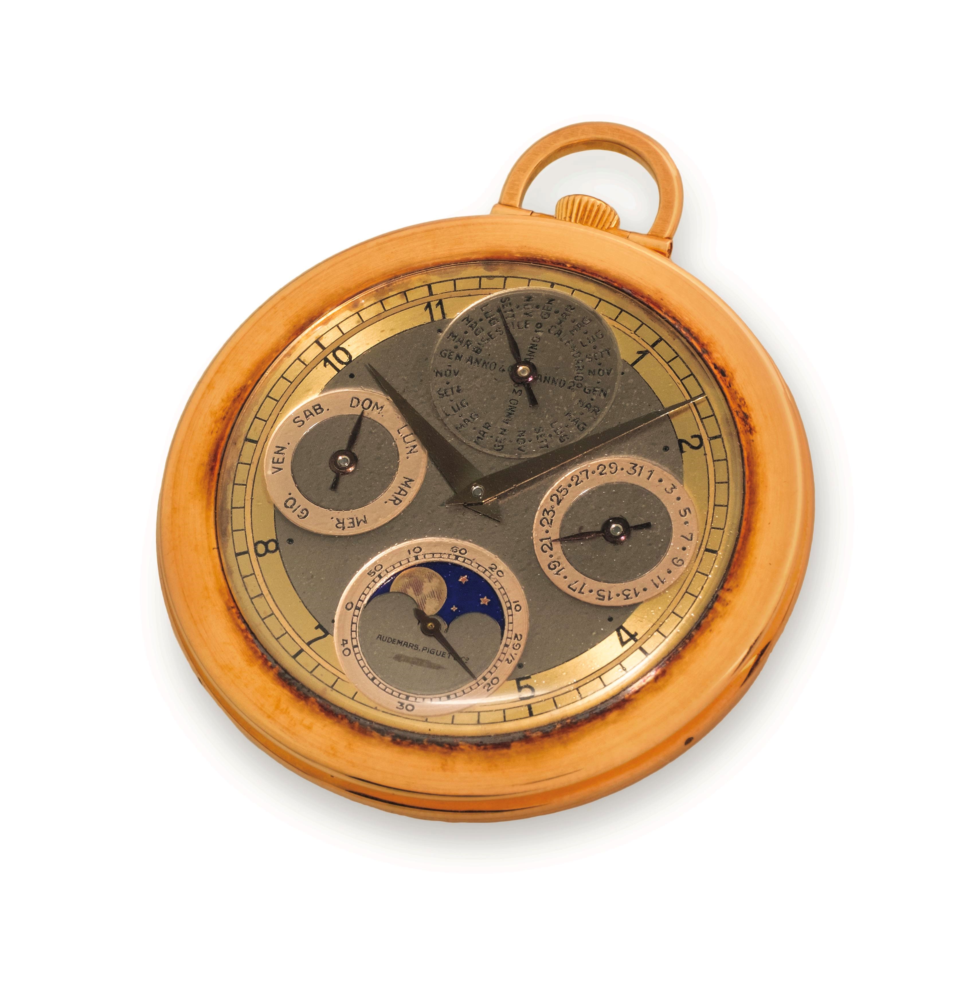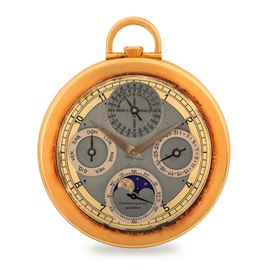 Orologio da tasca con calendario perpetuo e fasi lunari in oro rosa 18k, quadrante in tre colori, circa 1930