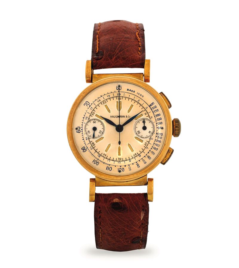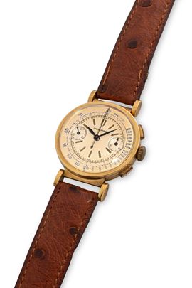 Cronografo in oro giallo 18k, quadrante champagne con contatori e scala tachimetrica, circa 1940