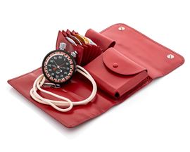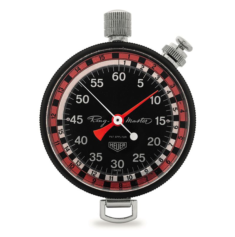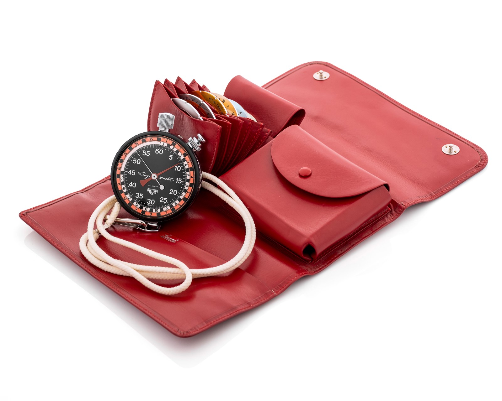 Stopwatch Ring-Master in acciaio, quadrante nero e ghiere graduate intercambiabili con astuccio in pelle Gucci, circa 1960