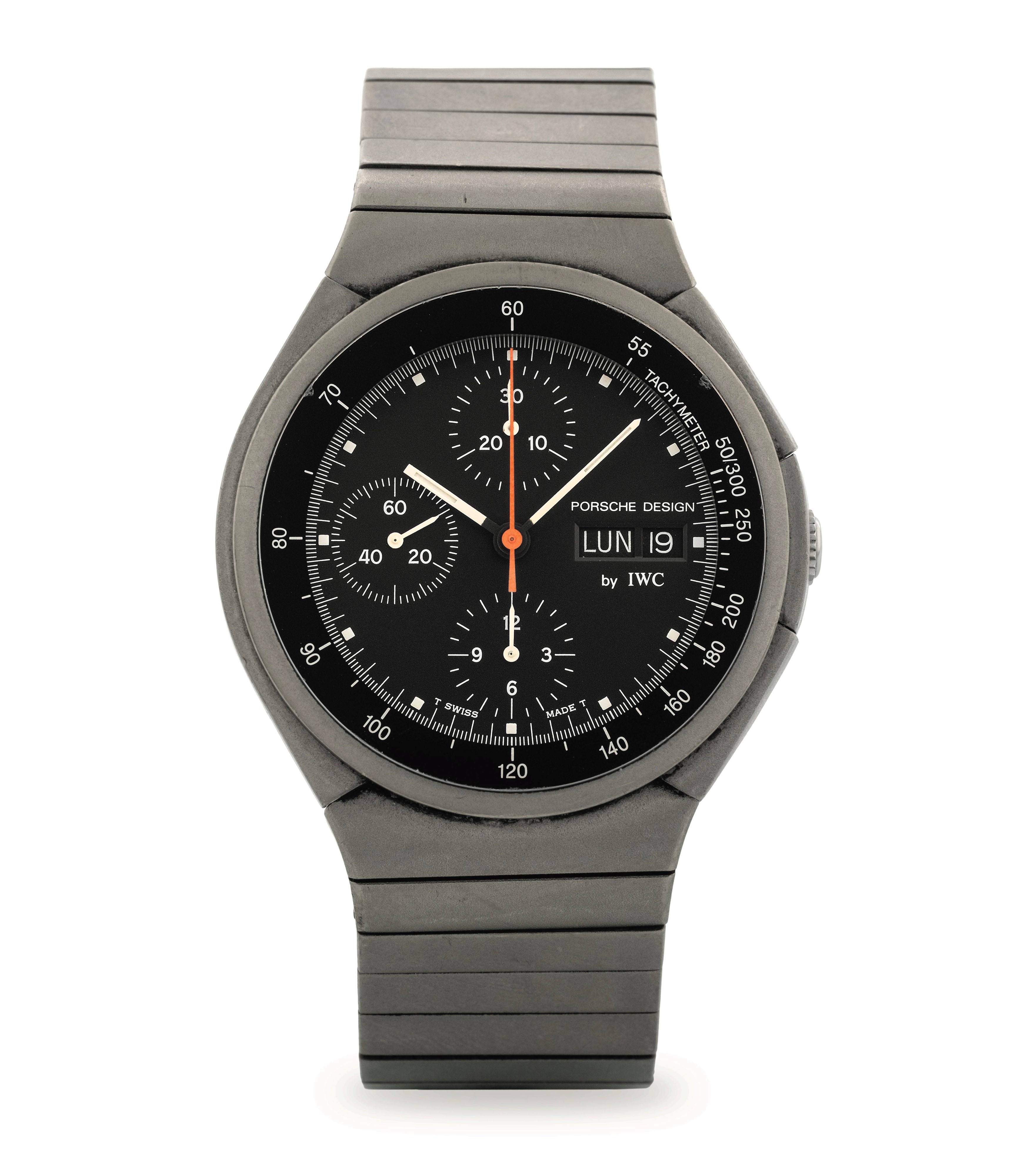 Porsche Design Chrono ref 3702 in titanio con bracciale integrato, quadrante nero con datario a doppia finestra e scala tachimetrica, con scatola, circa 1980