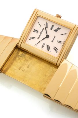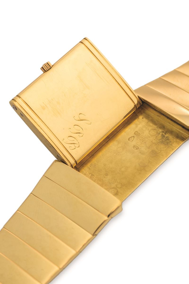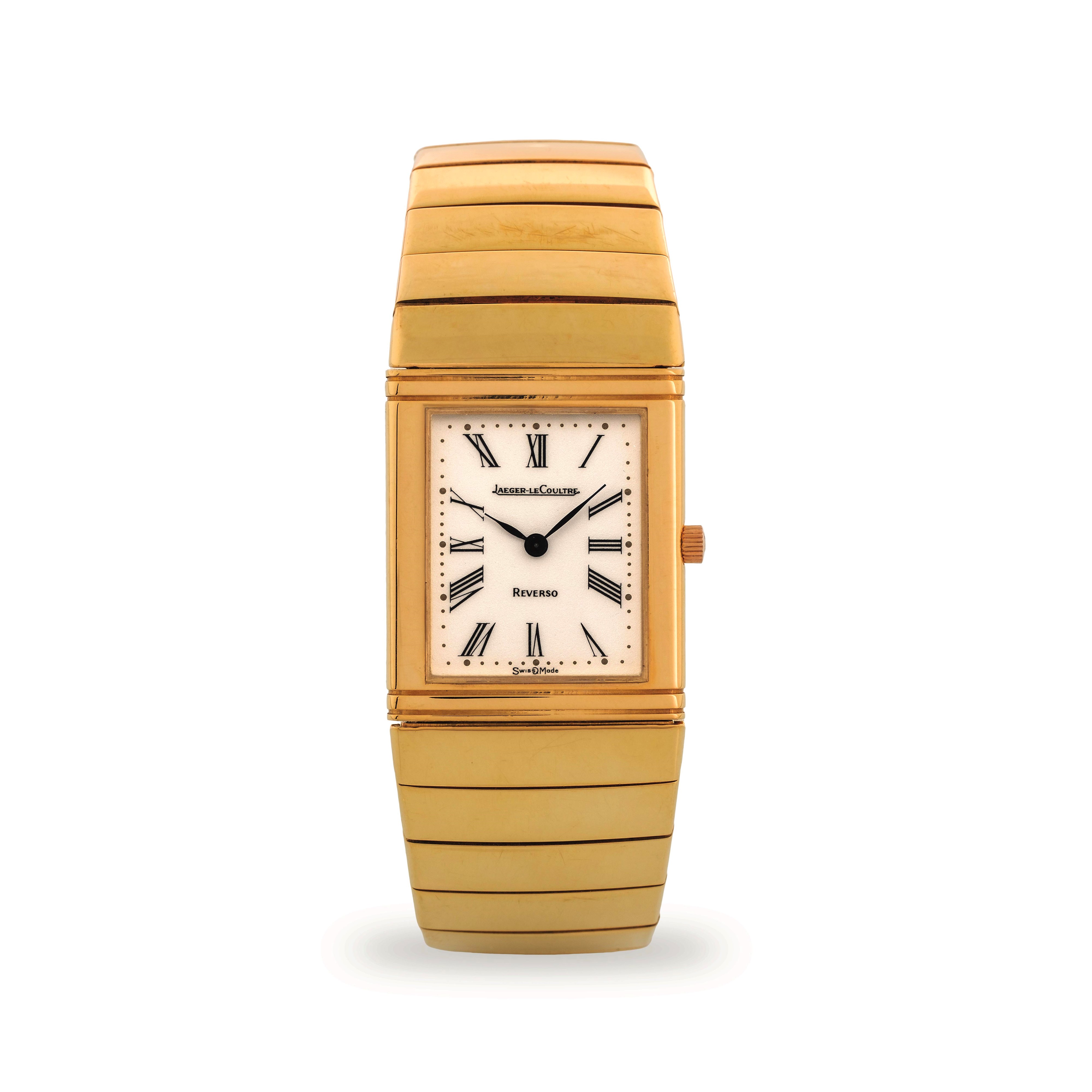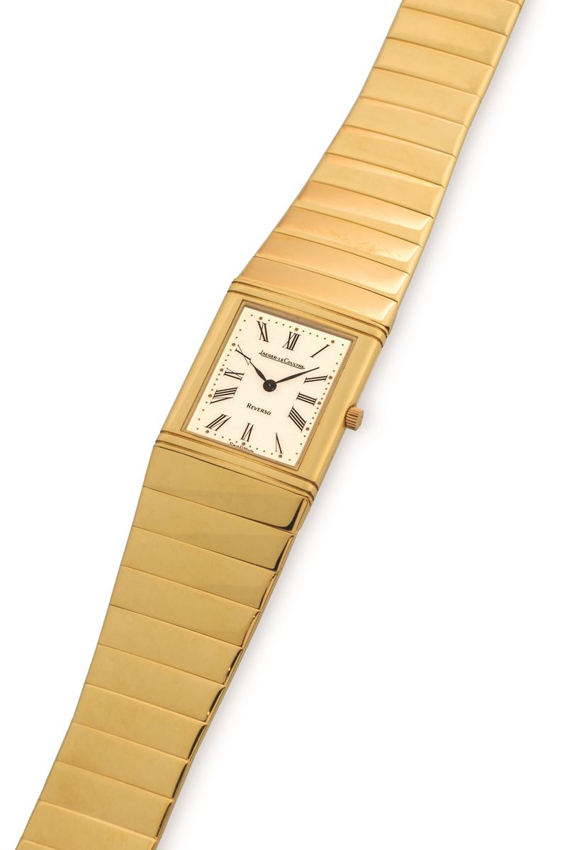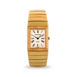 Reverso in oro giallo 18k con bracciale integrato, quadrante bianco opaco con numeri romani, circa 1990