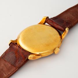 Calatrava in oro giallo 18k, quadrante nero con numeri romani e secondi al 6, circa 1950