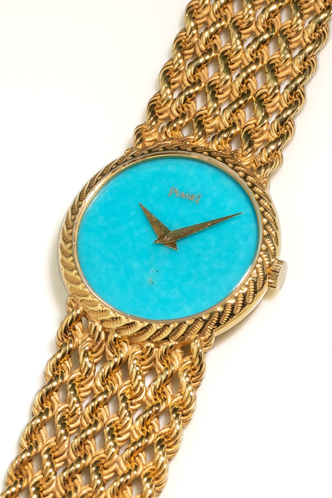 Classique da polso in oro giallo con bracciale lavorato integrato, quadrante in pietra turchese, circa 1970