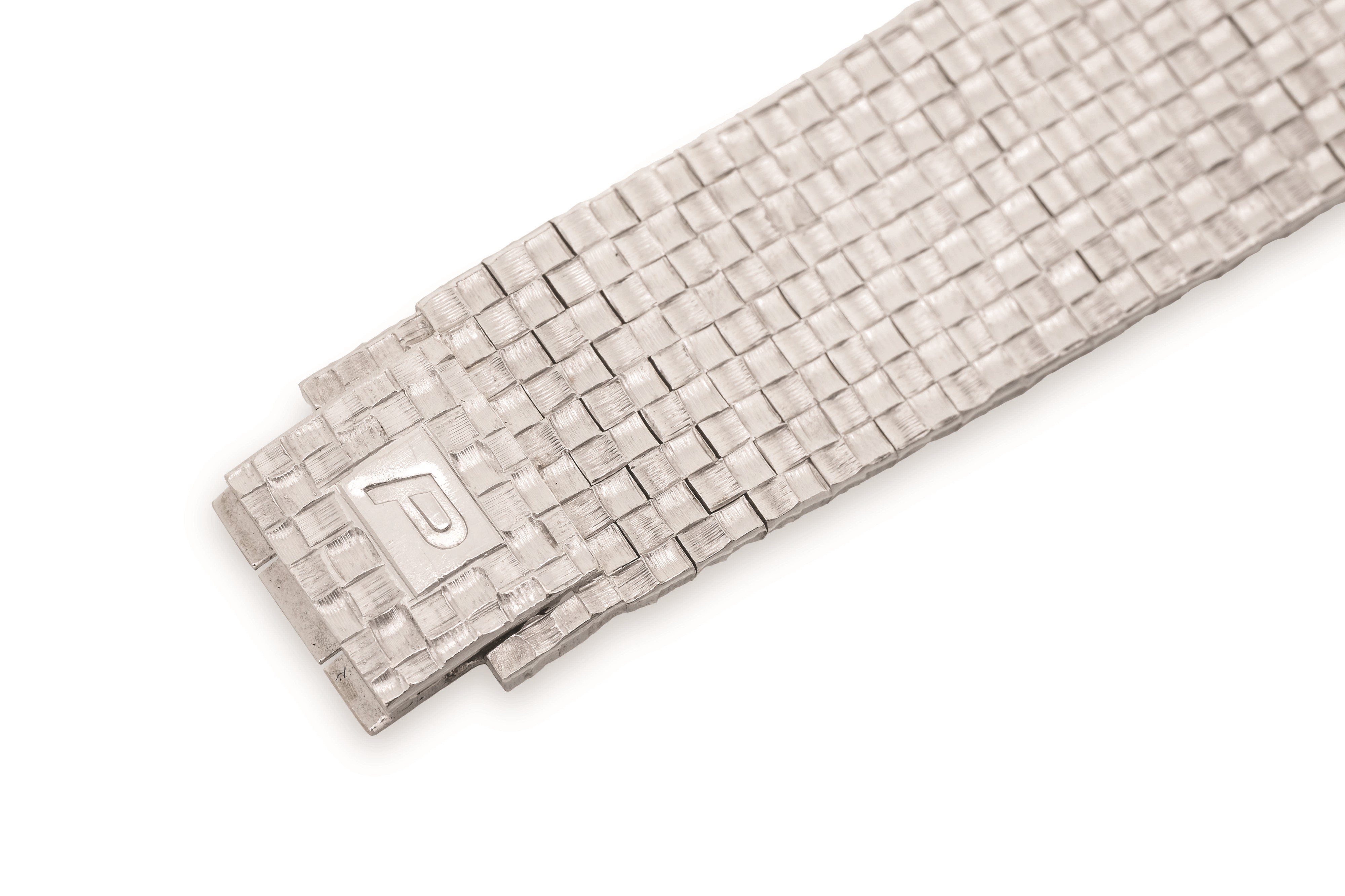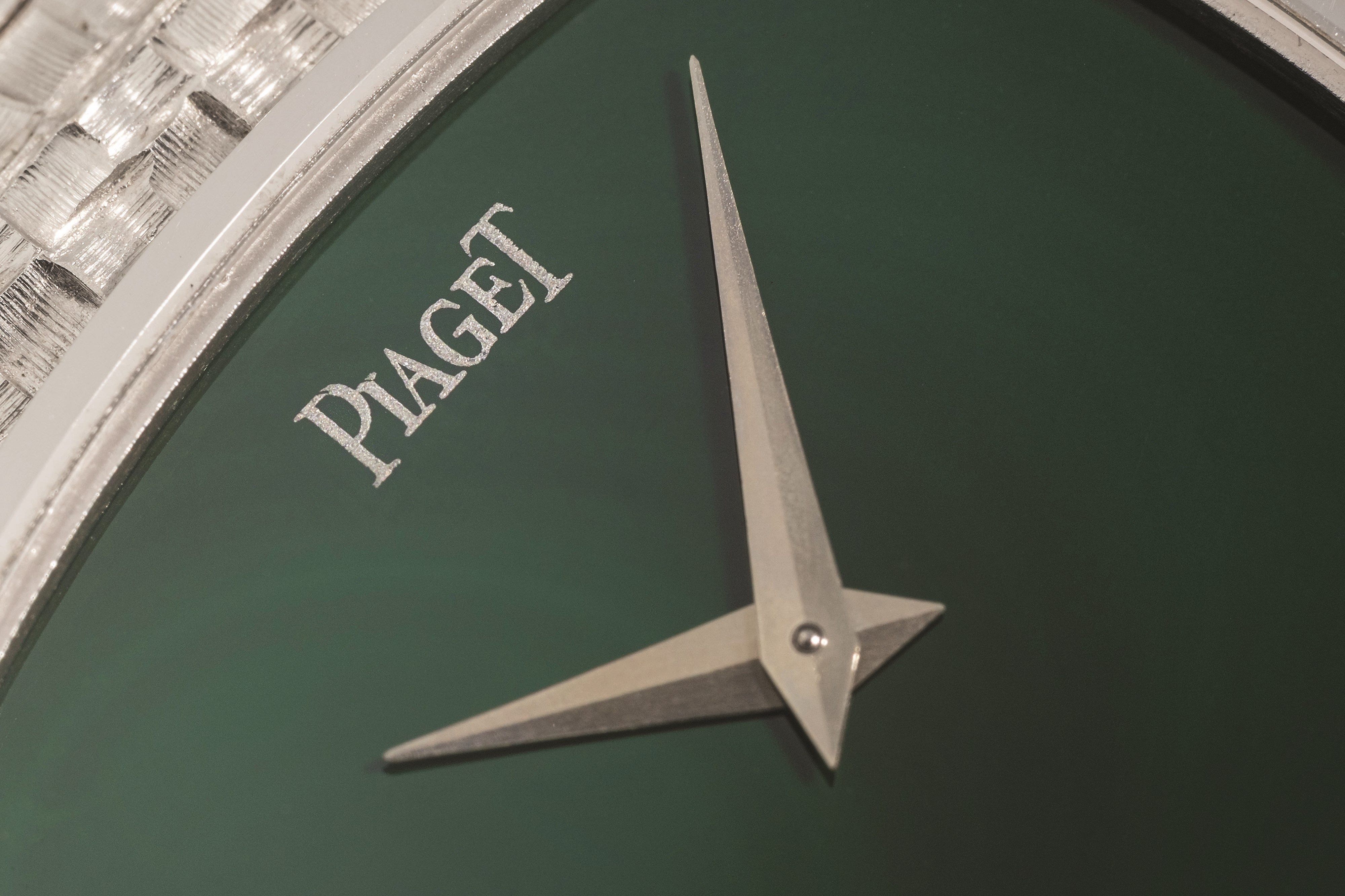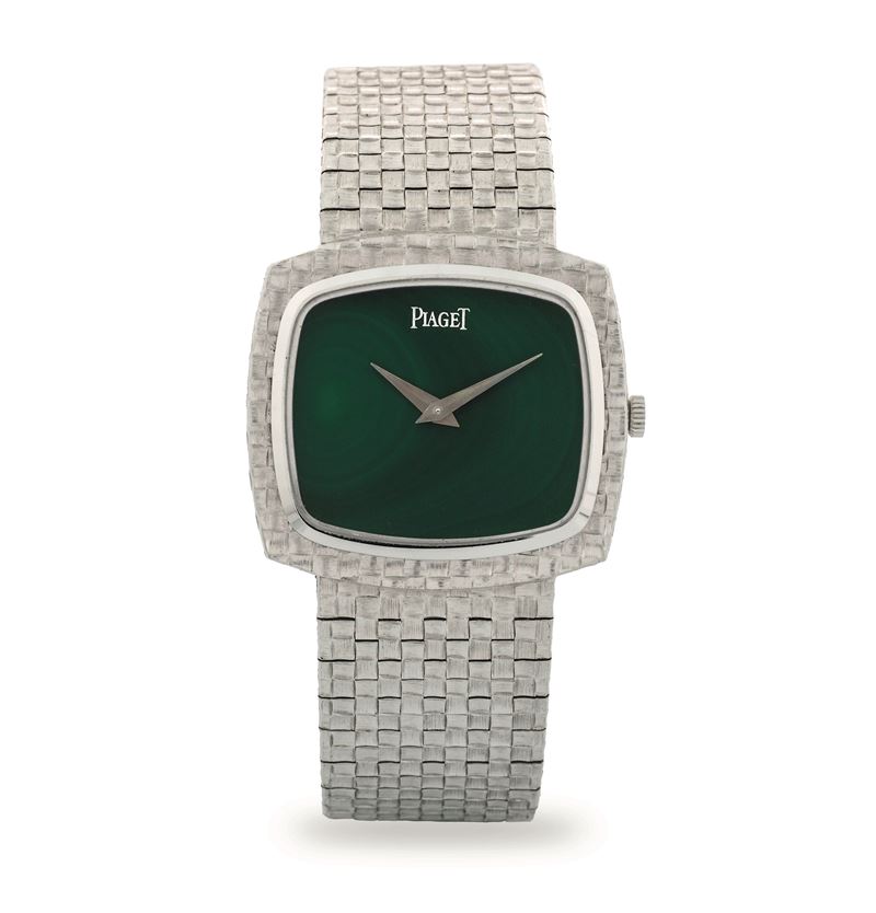 Elegante orologio da polso ultrapiatto ref 9571H in oro bianco con bracciale integrato, quadrante malachite, circa 1970