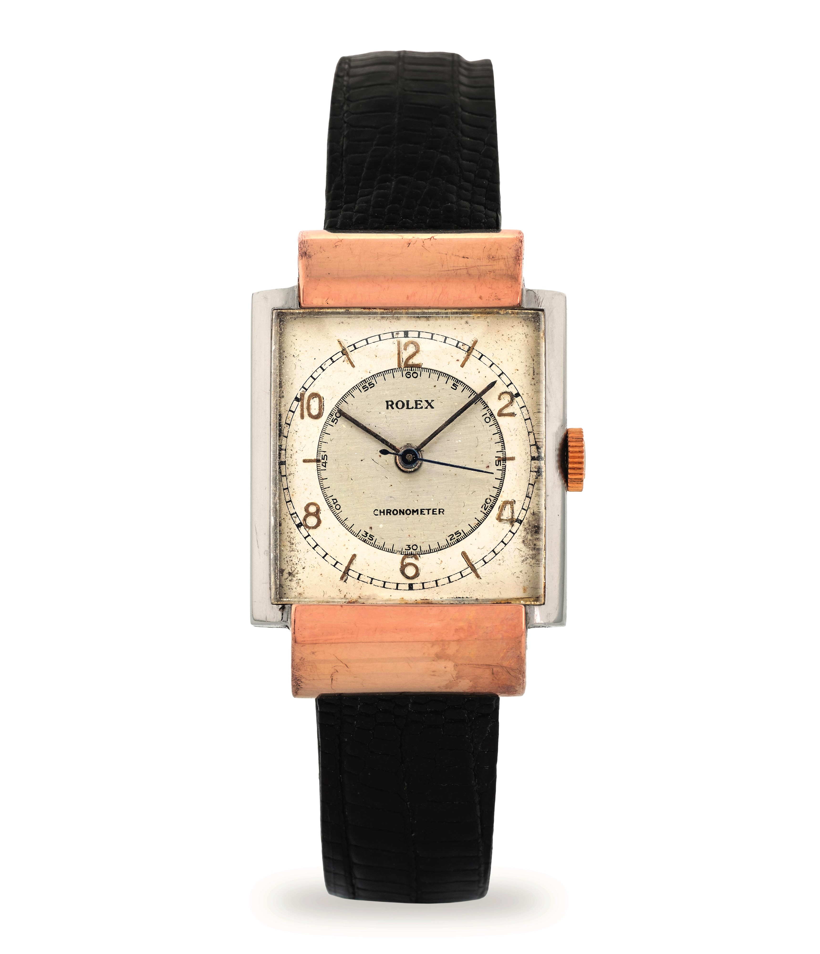 Chronometre in acciaio e oro rosa, carica manuale con anse Cachè, quadrante bitonale, circa 1940