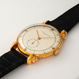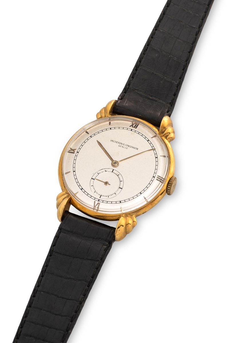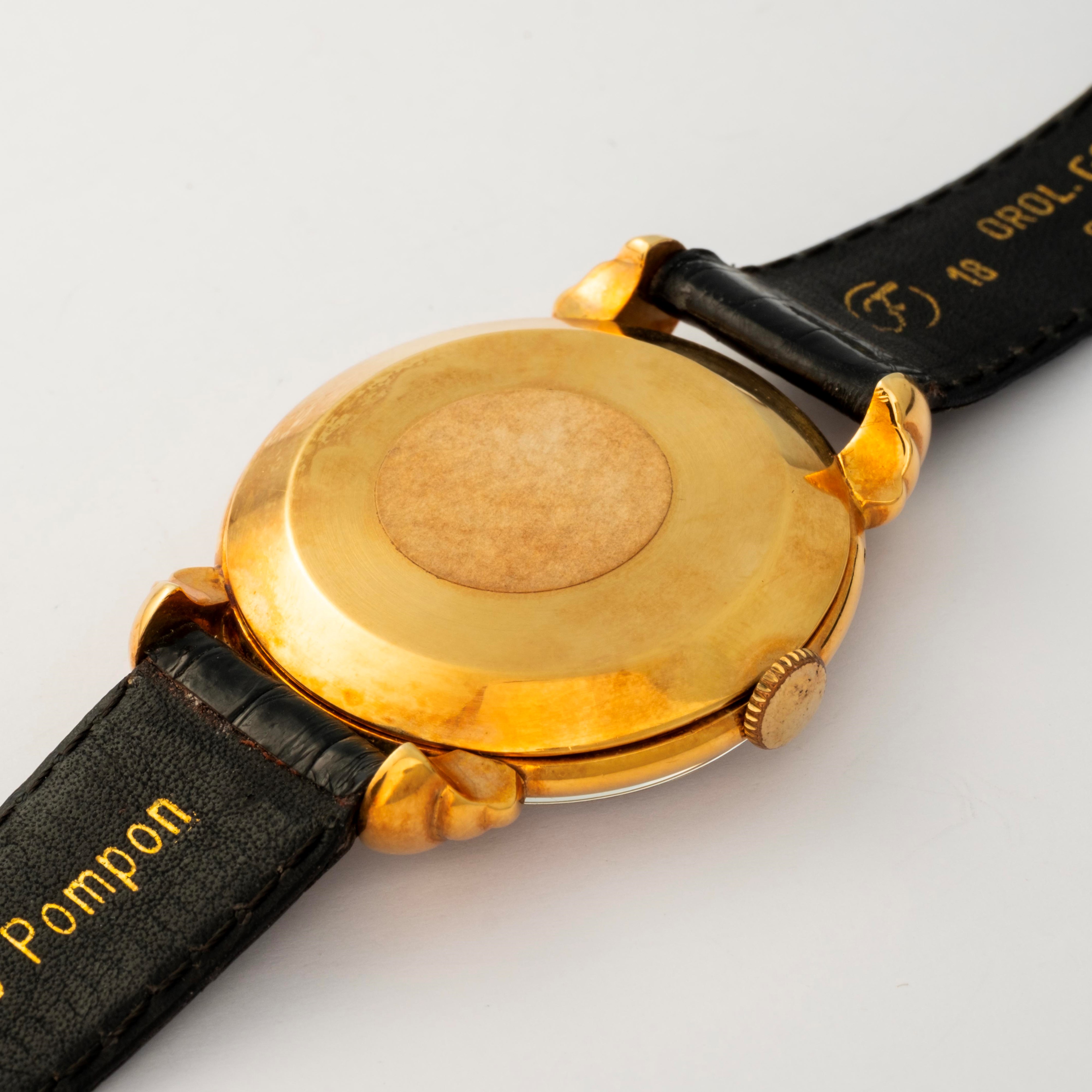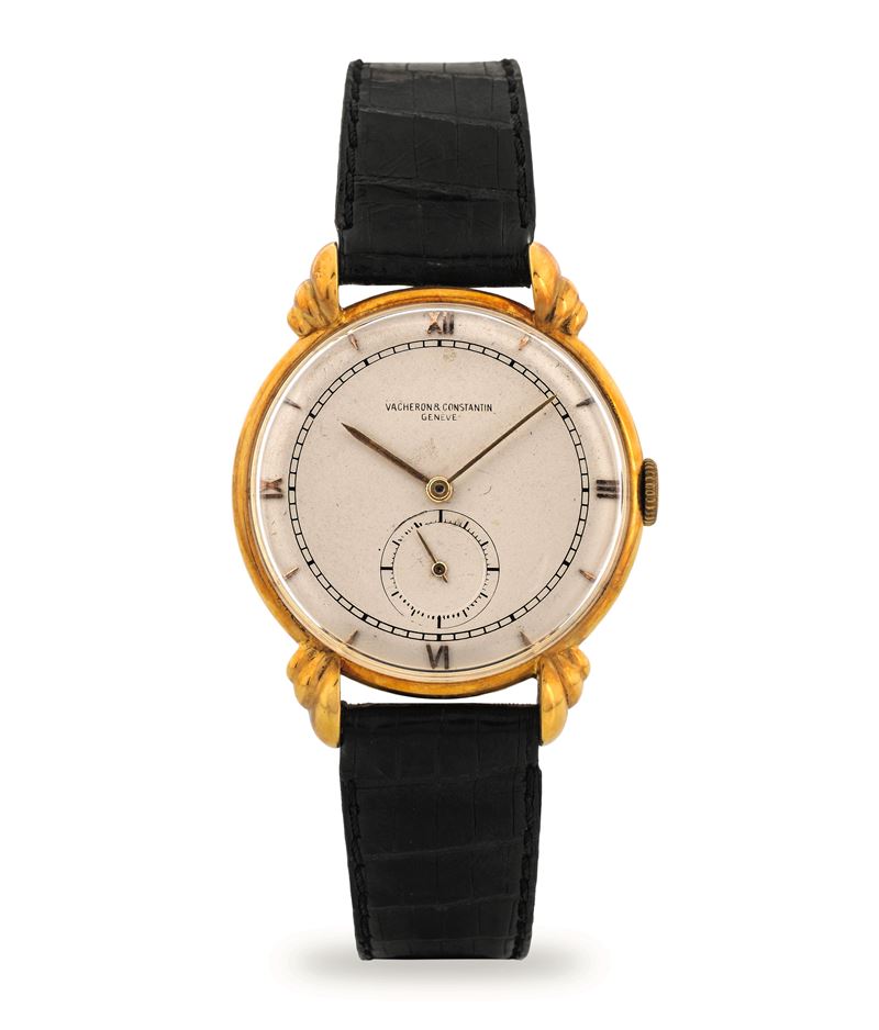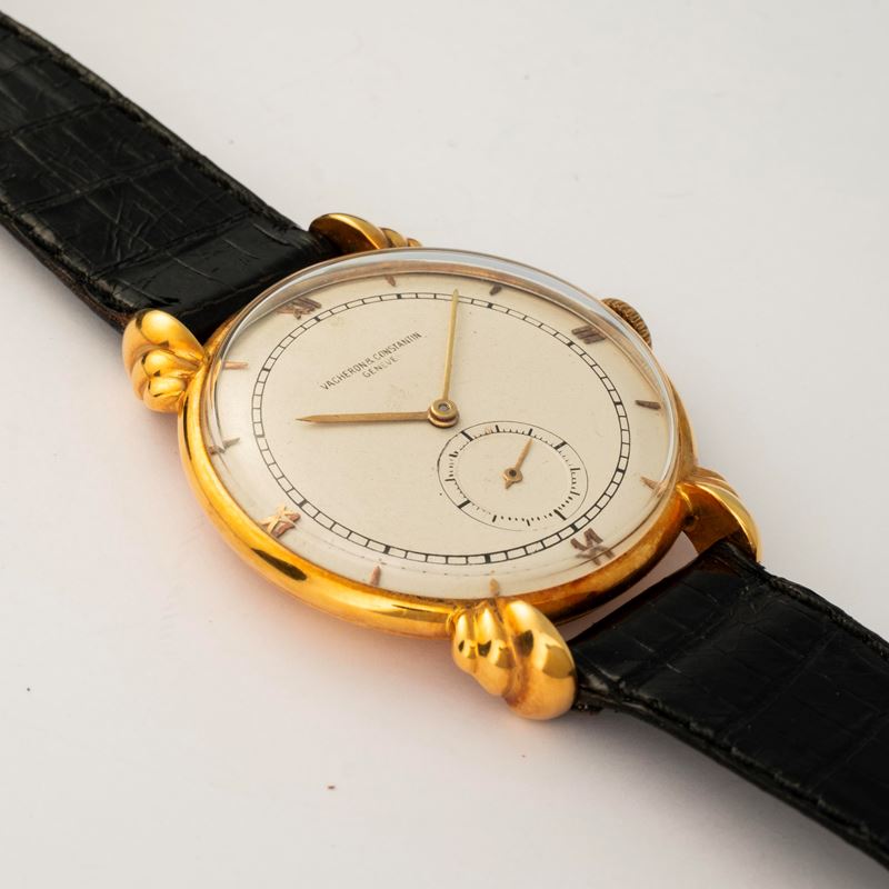 Fancy Lugs in oro giallo 18k, quadrante argenté con numeri romani applicati e secondi al 6, circa 1945