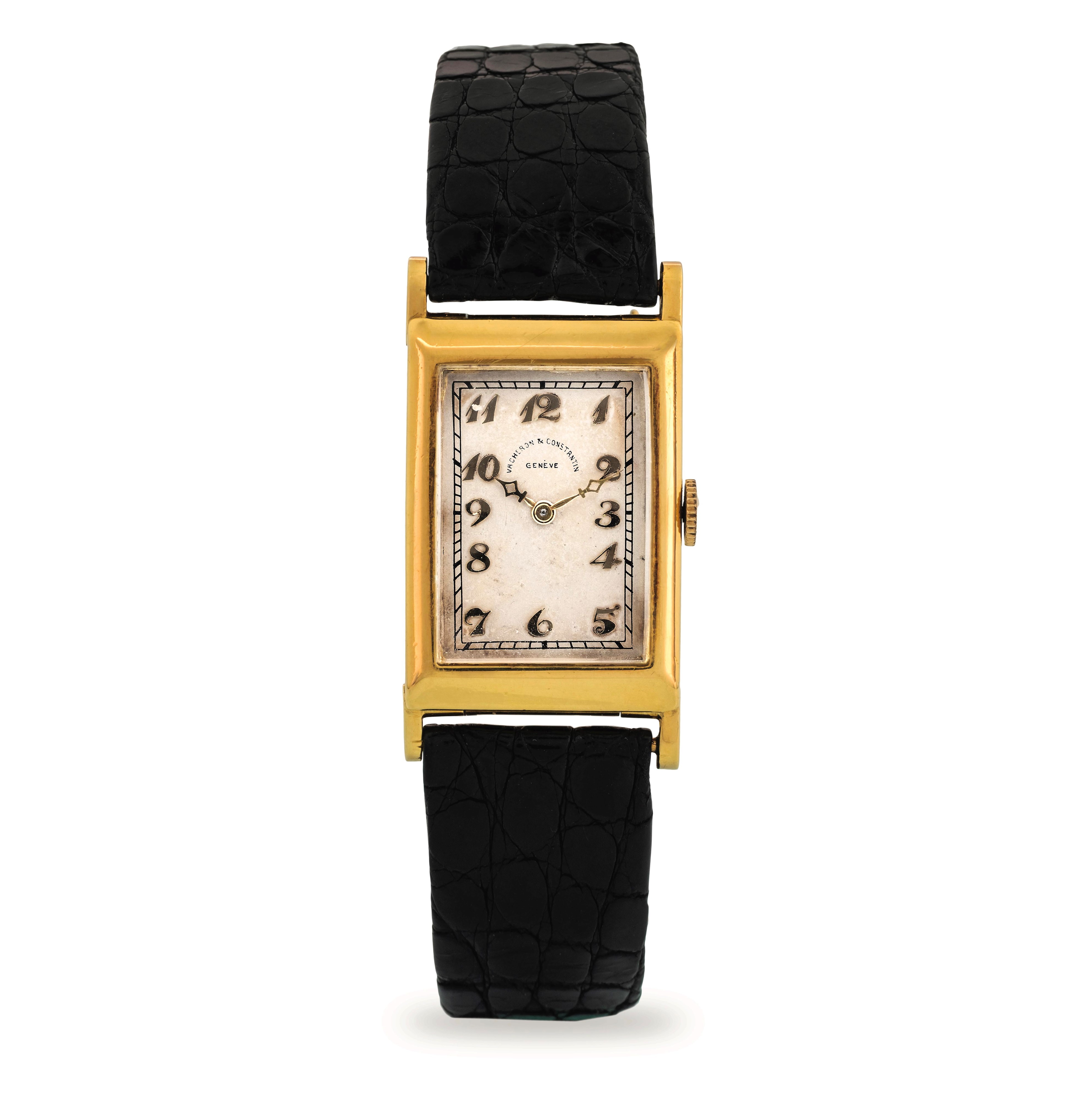 Tank Art Decò in oro giallo 18k con anse basculanti, quadrante argenté con numeri applicati, con scatola ed estratto d'archivio, circa 1928