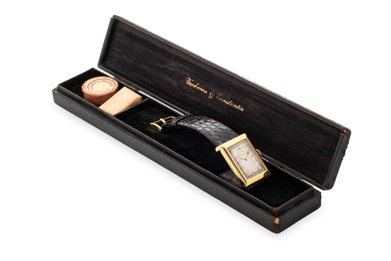 Tank Art Decò in oro giallo 18k con anse basculanti, quadrante argenté con numeri applicati, con scatola ed estratto d'archivio, [..]