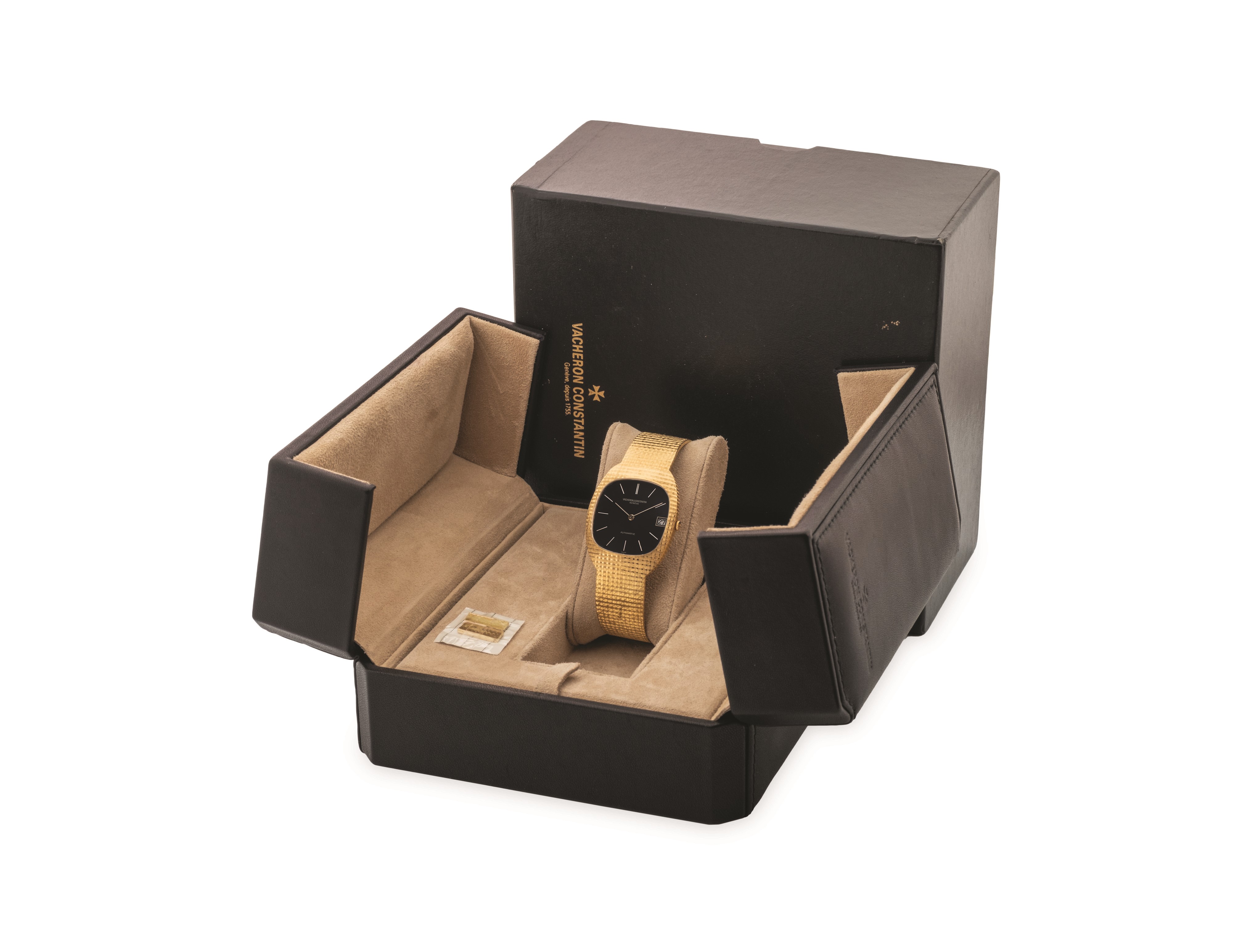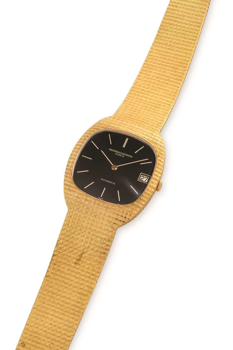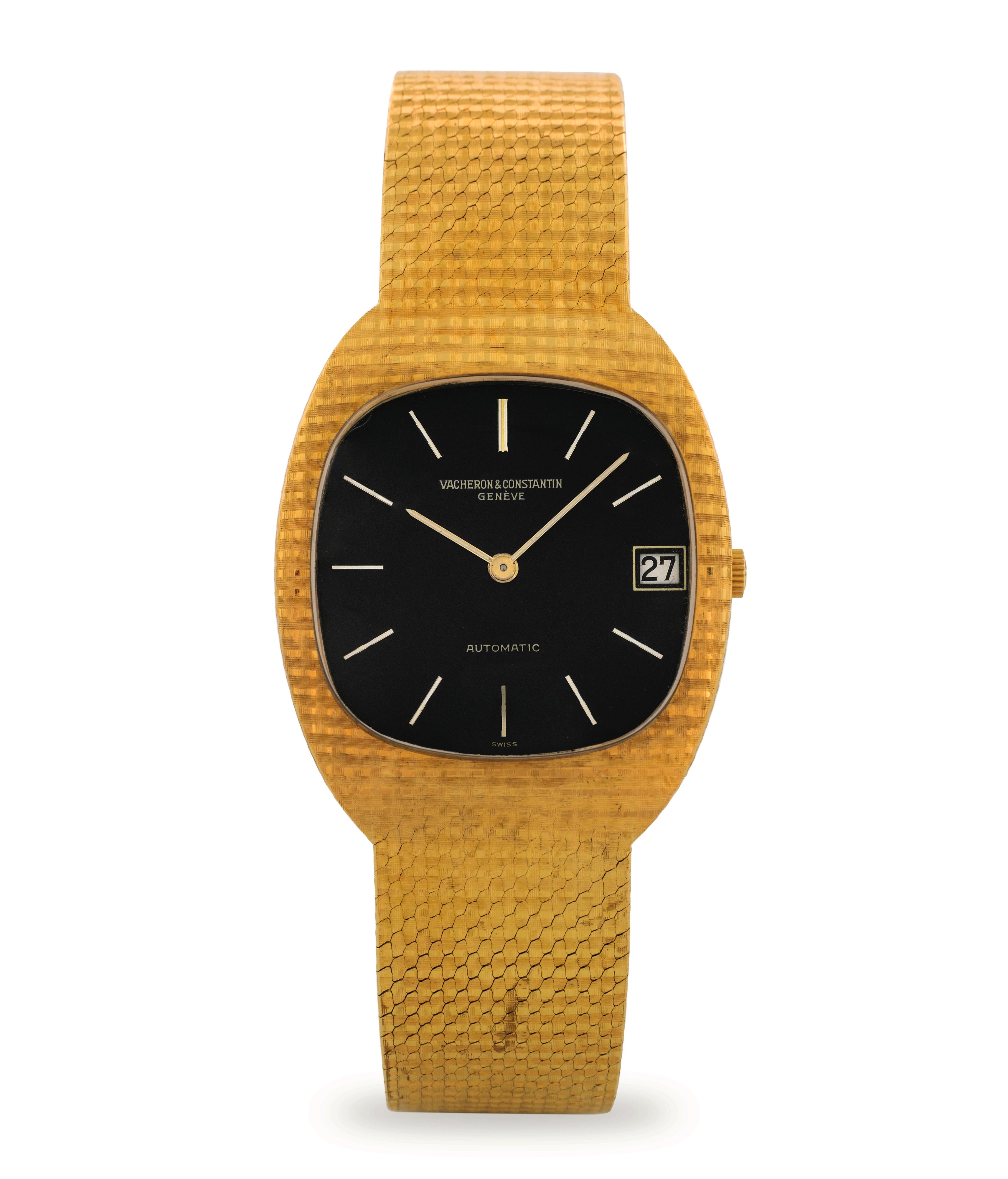 Tonneau ref 2034 Q in oro giallo 18k con bracciale lavorato integrato, quadrante nero laccato, con scatola originale, circa 1975