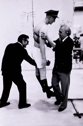 Federico Fellini e Marcello Mastroianni, scena tratta dal film “La città delle donne”, 1980 ca
