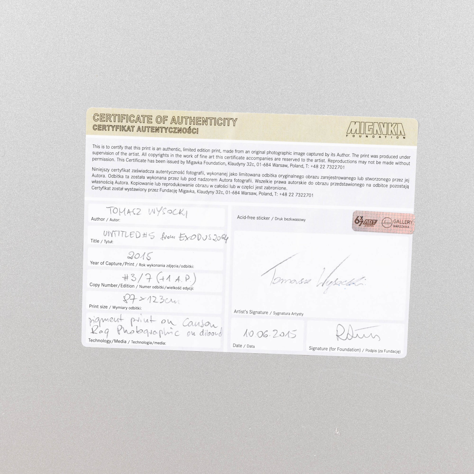 L’opera è corredata da Certificato di Autenticità rilasciato e firmato dall’artista applicato al retro.