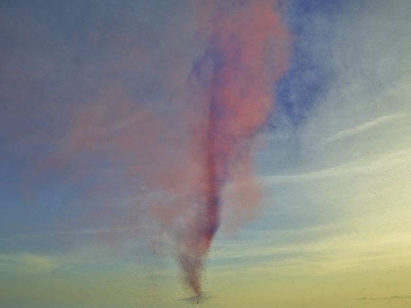 Pigmenti organici su elementi geometrici all'aria aperta. Il vento è l'attore principale, mentre la casualità è il campo comune.