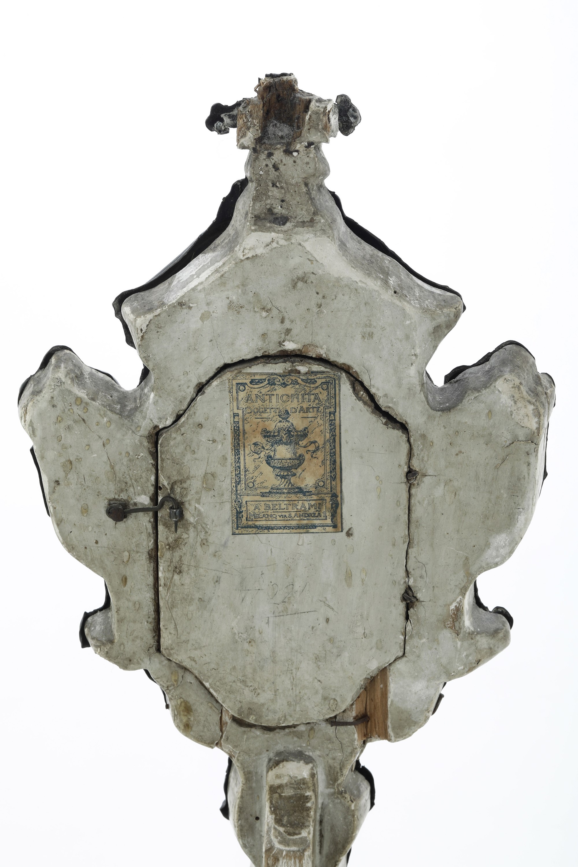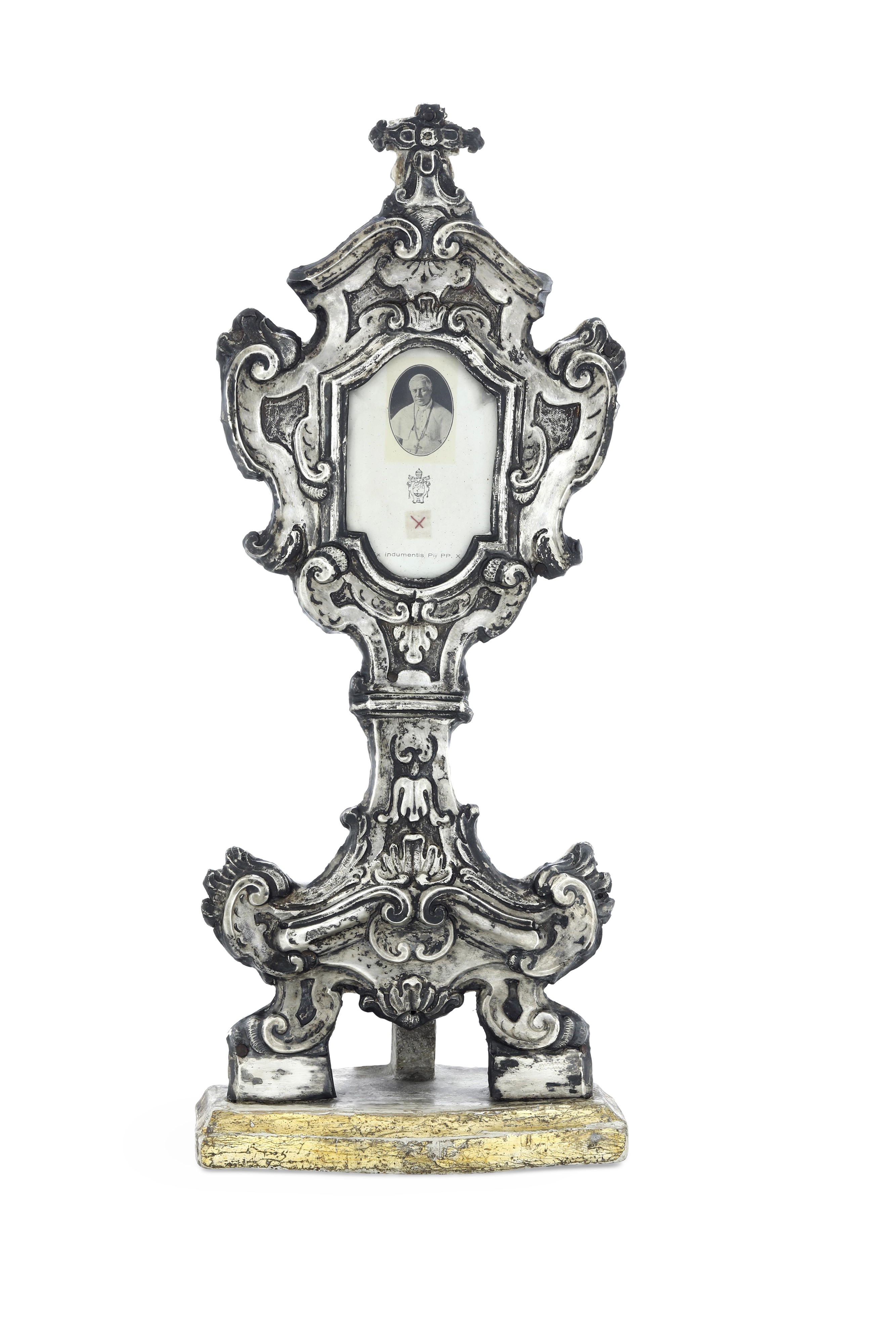 Lamina d'argento sbalzato e legno sagomato dipinto e dorato