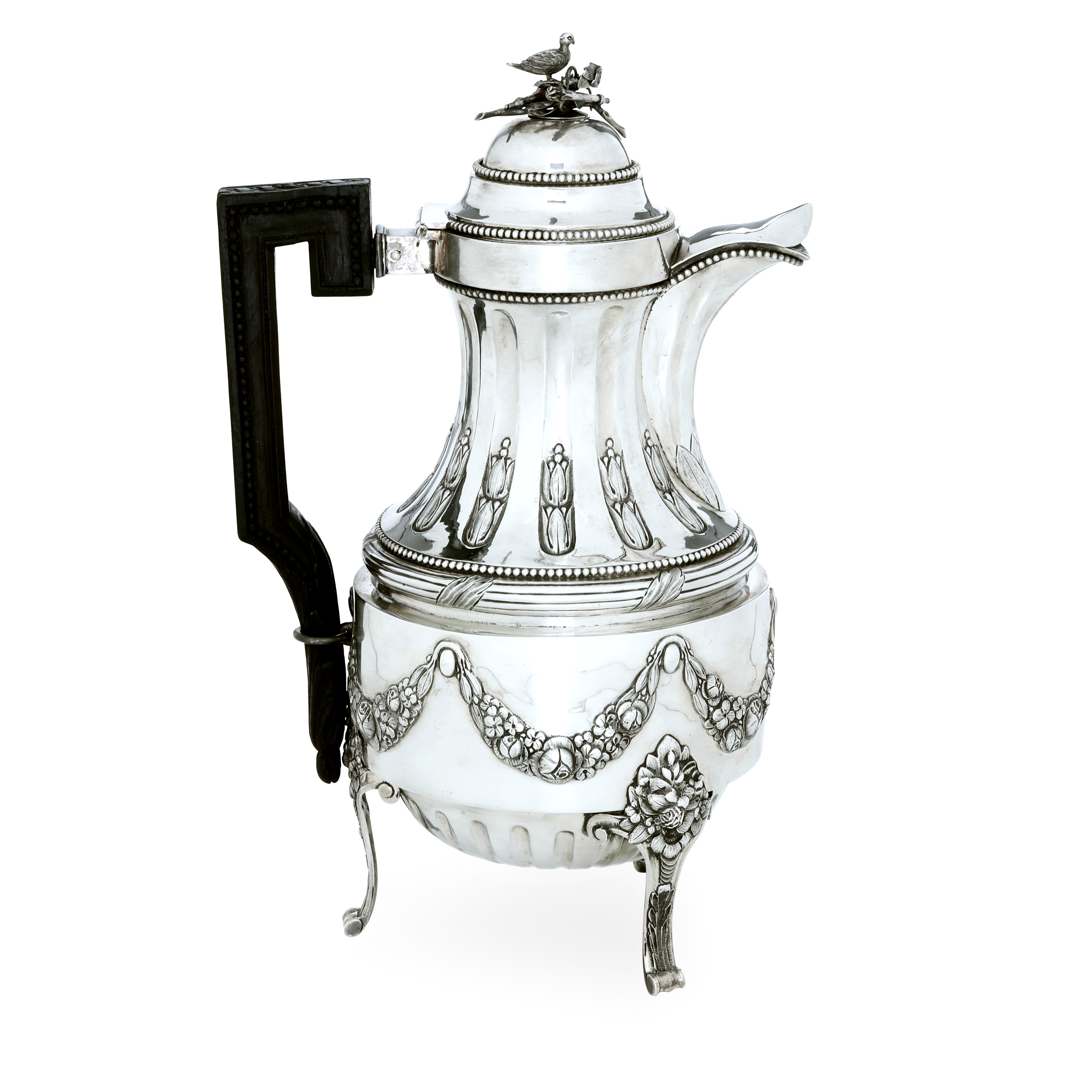 Eleganti decori con festoni, fasce nervate, perlinature e rastremature. Sostegno a tripode, presa raffigurante motivo allegorico con colomba e manico intagliato ed ebanizzato