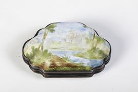Forma sagomata con scena bucolica dipinta a smalti policromi sul coperchio