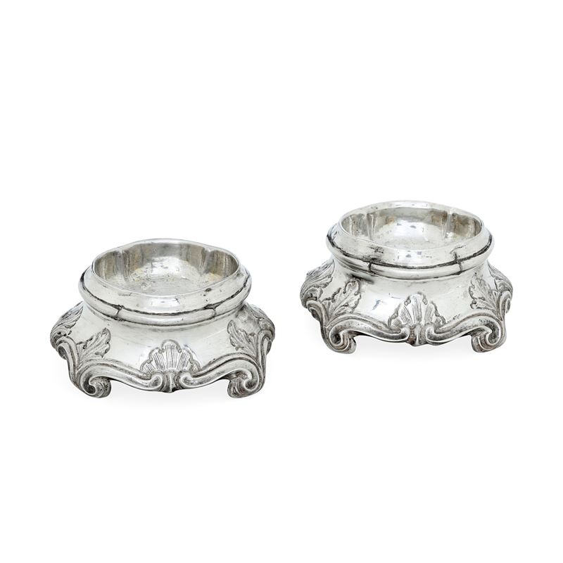 Genova, possibile XVIII secolo. Marchio di ricontrollo con croce mauriziana e delfino Coppia di saliere