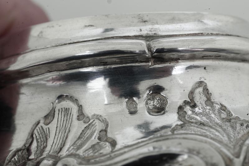 Corpo ovale sagomato e bordo nervato con decori a volute rocaille e motivi fogliacei
