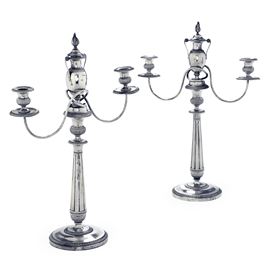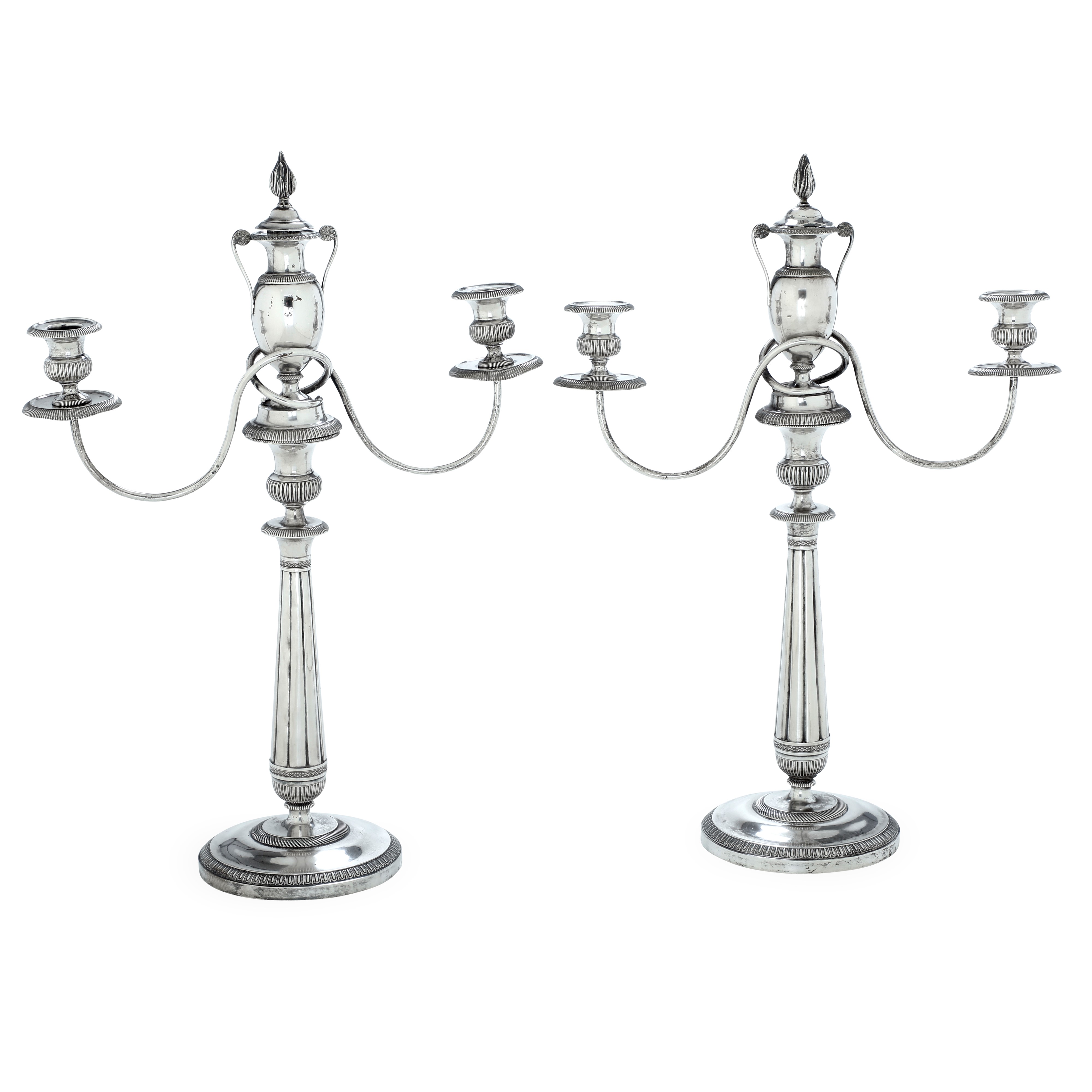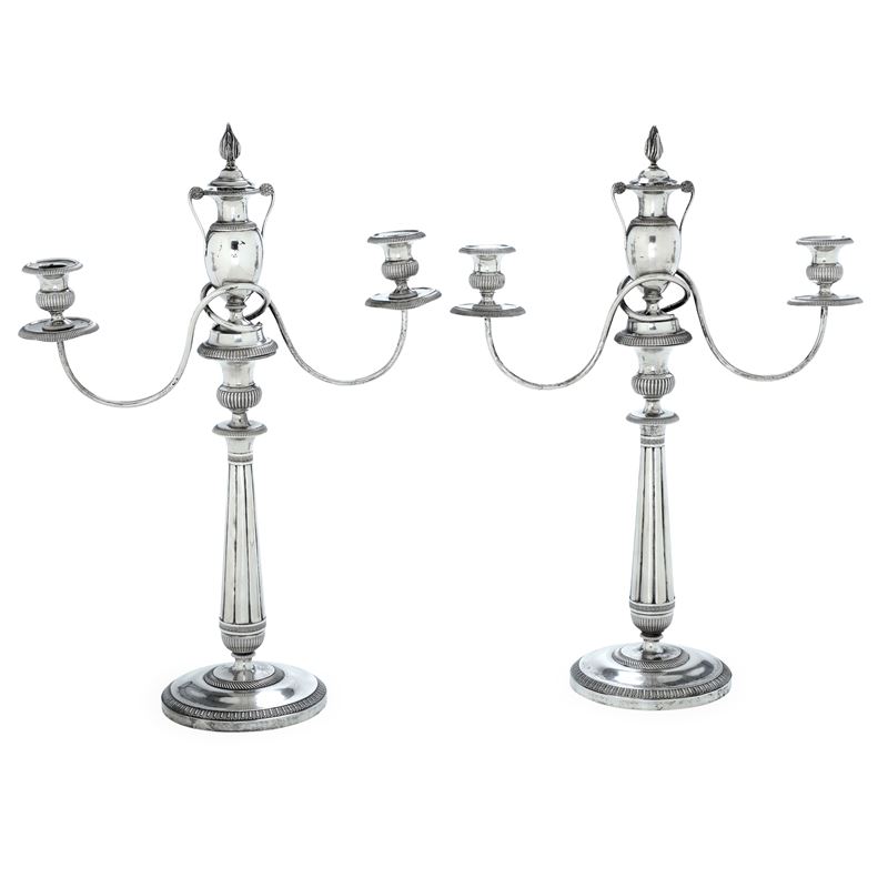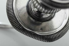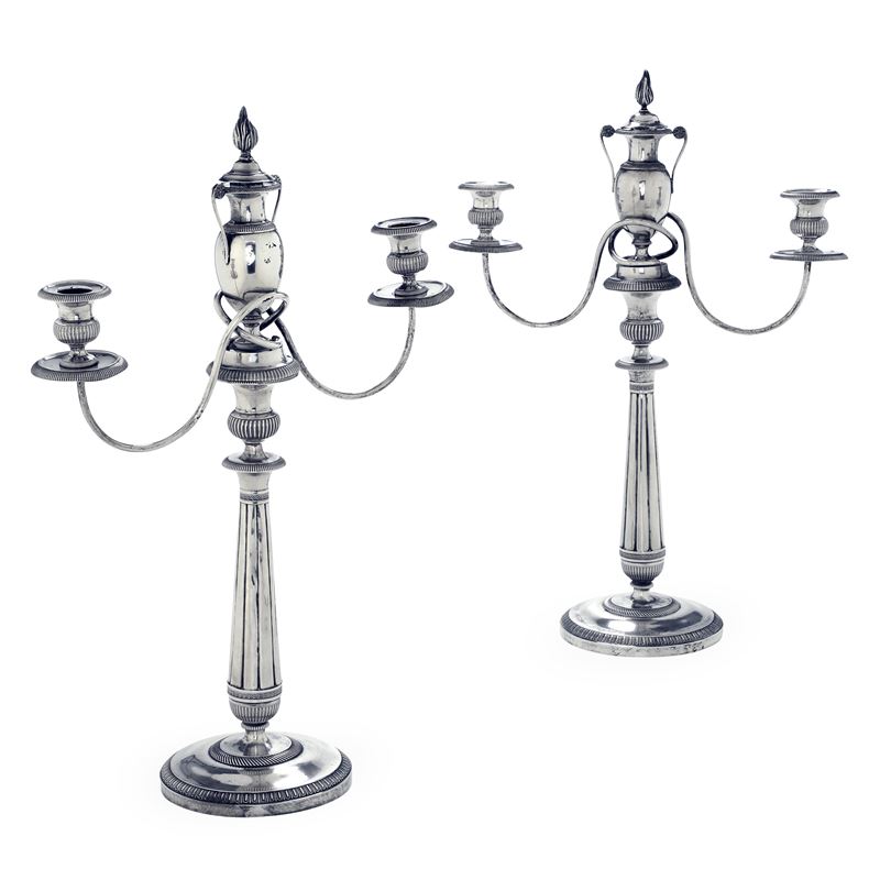 Fusto a colonna rastremata poggiante su piede circolare gradinato. Bracci sagomati a volute intrecciate centrati da motivo ad anfora di gusto neoclassico