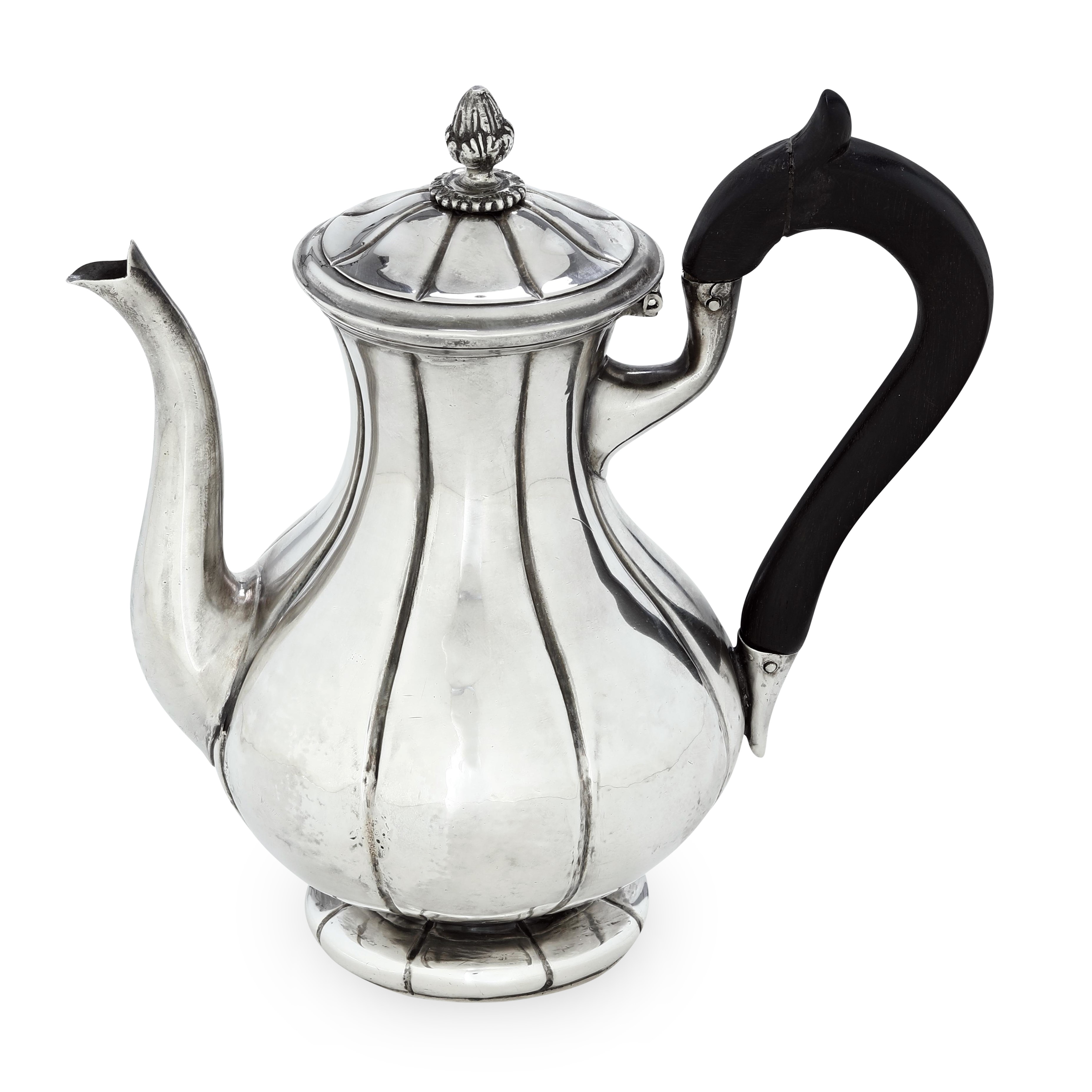 Corpo piriforme con larghe costolature poggiante su basso piede circolare. Manico in legno sagomato