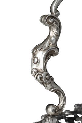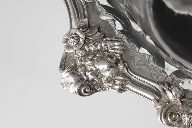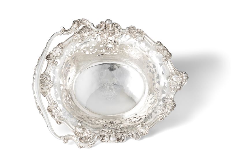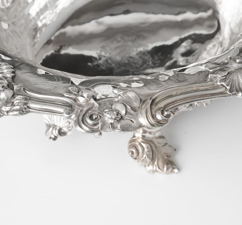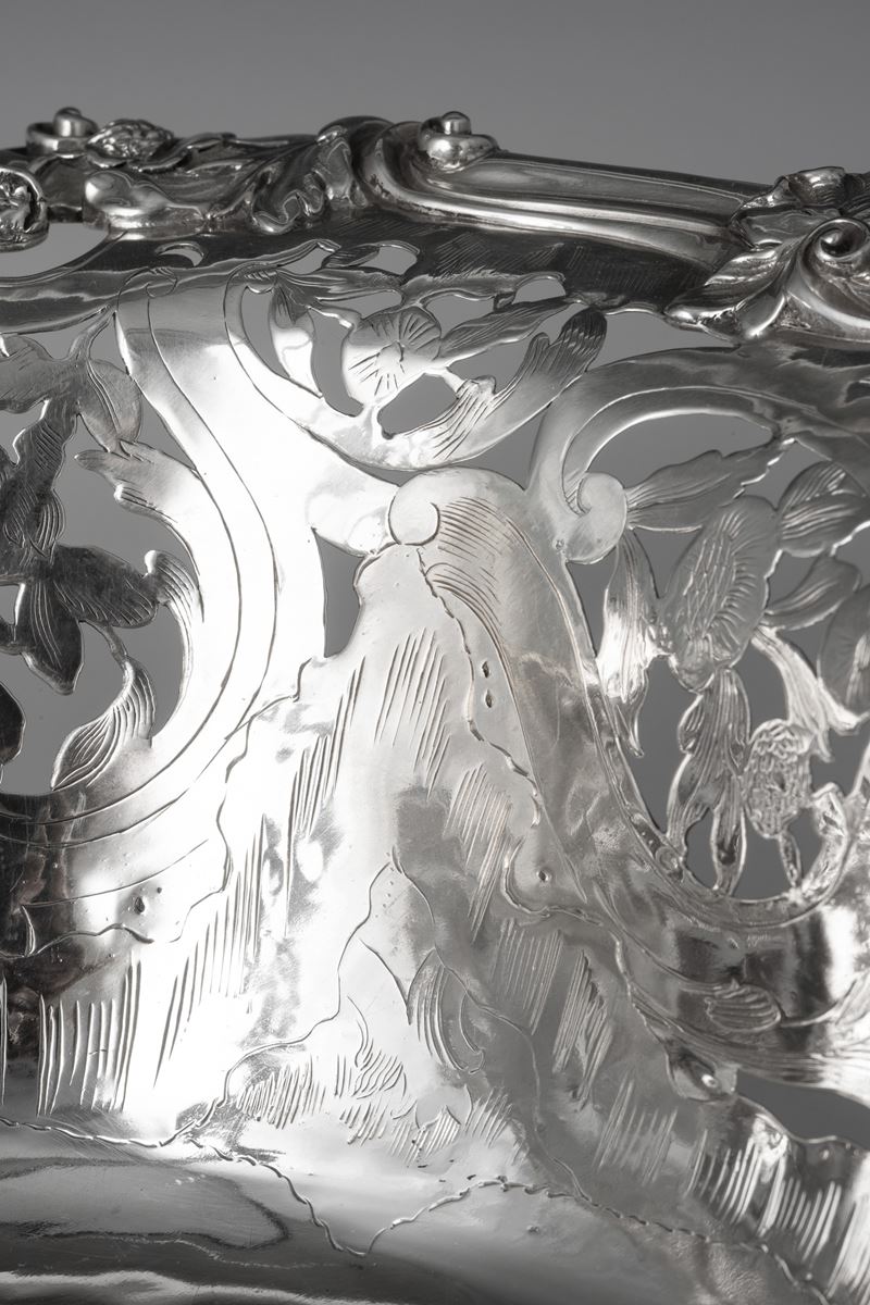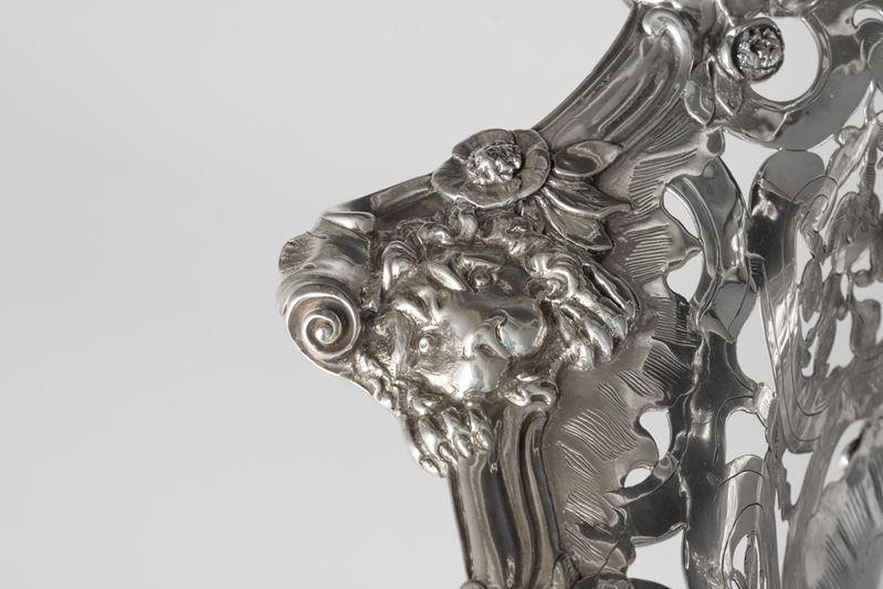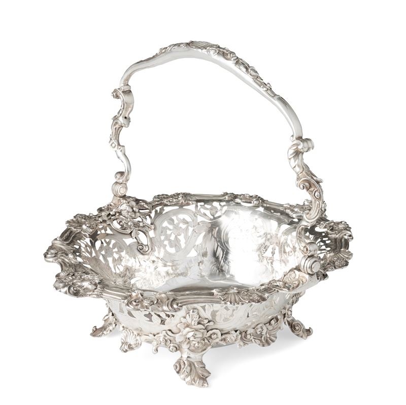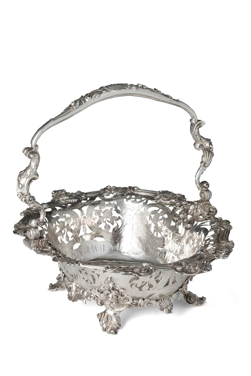 L'equilibrio stilistico ed estetico, oltre ai marchi presenti sul fondello, rimandano per la straordinaria qualità esecutiva all'opera del più importante maestro orafo operante in Inghilterra nella seconda metà del XVIII secolo, il celebre Paul de Lamerie. Nato nei Paesi Bassi, figlio di un nobile ugonotto francese, trasferitosi a Londra nel 1688, si formò nella bottega di Pierre Platel (1659-1739) aprendo una sua attività nel 1713 e in breve divenendo anche fornitore della corona e della corte inglese. La sua eccezionale abilità nel creare opere in uno stile rococò ricco di elaborati virtuosismi ed invenzioni nelle forme e di raffinate decorazioni cesellate lo fece conoscere anche oltremanica come testimoniano le opere eseguite per il re del Portogallo Giovanni V. Il nostro raro argento, eseguito in un abilissimo gioco di forme e di luci tra la leggerezza delle superfici traforate e finemente incise e la forza degli aggettanti volumi delle parti fuse e magistralmente cesellate in un tripudio di foglie, fiori, volute, conchiglie e figure zoomorfe trova riscontri stilistici con analoghe opere come i cestini conservati presso il Museum of Fine Art di Boston eseguito nel 1744 o con quello appartenente al The Clark Institute a Williamstown, Massachussetts datato 1745.