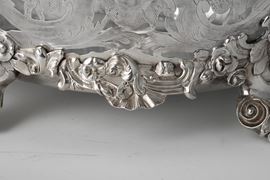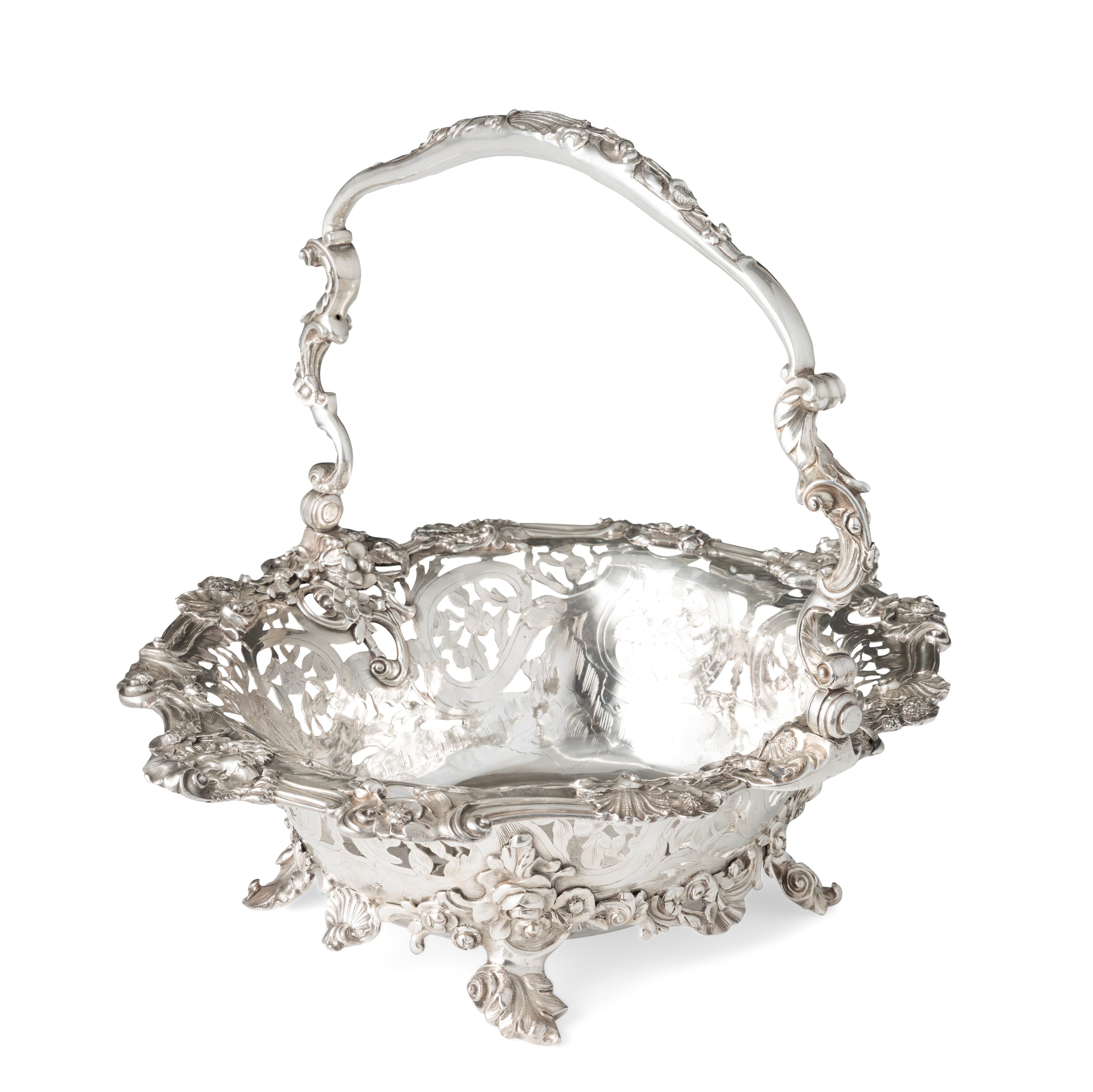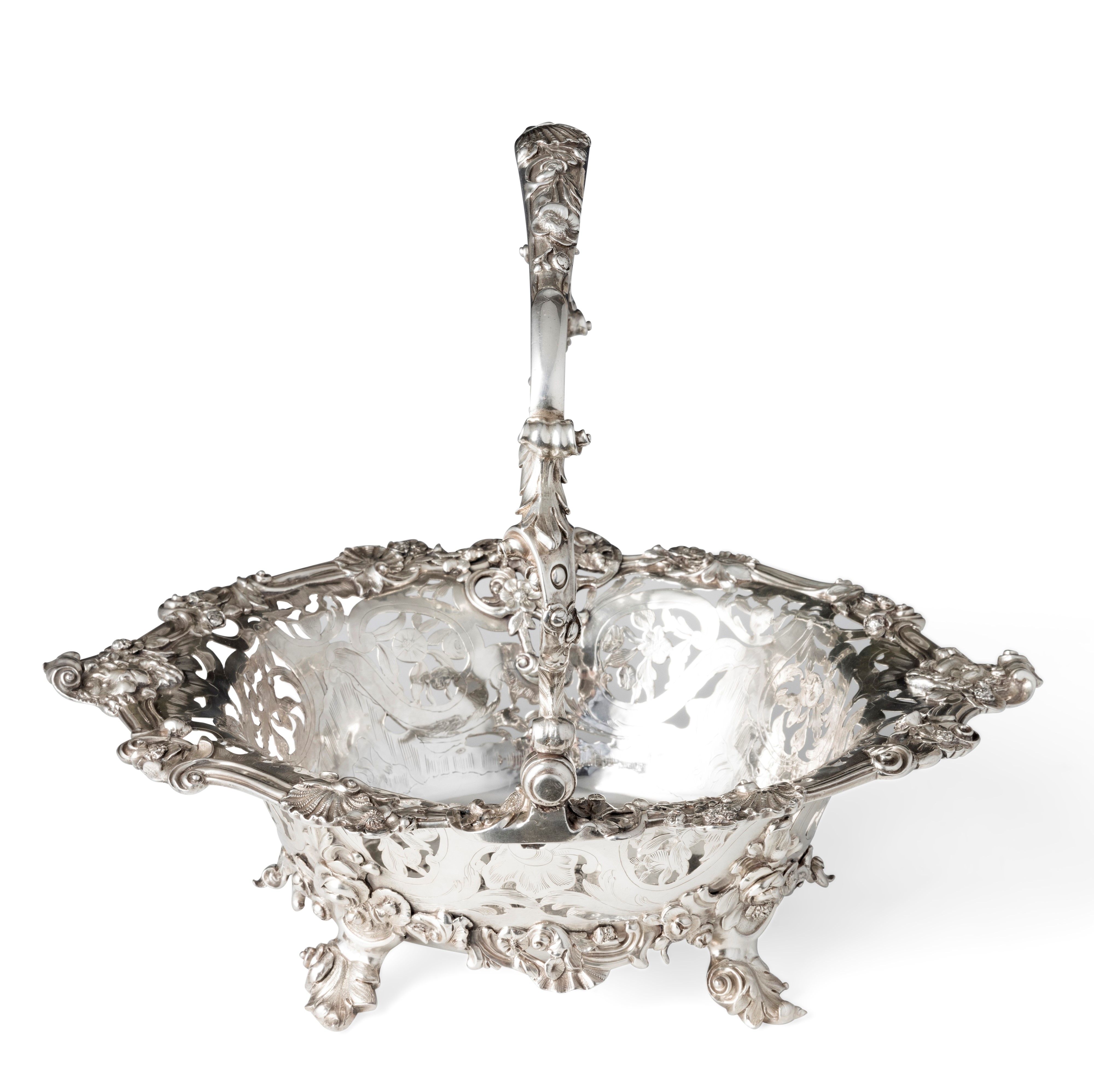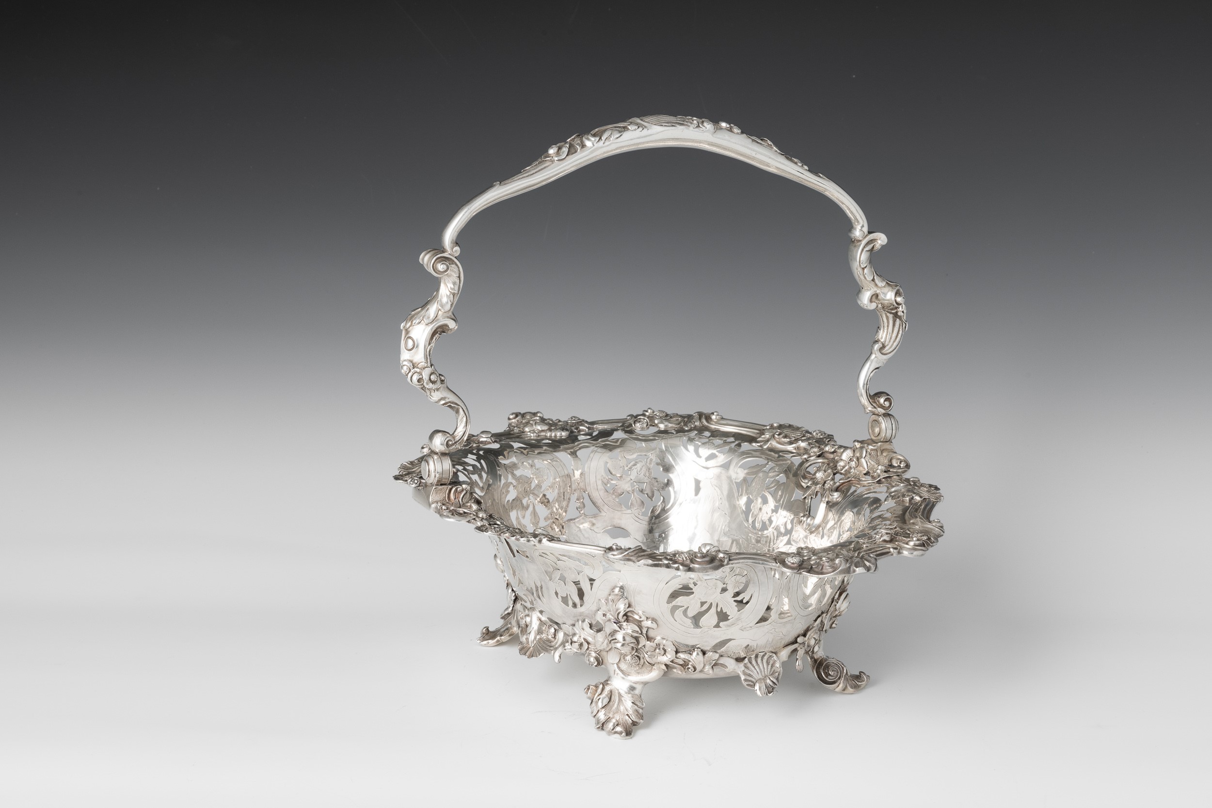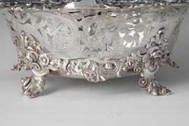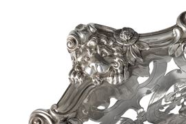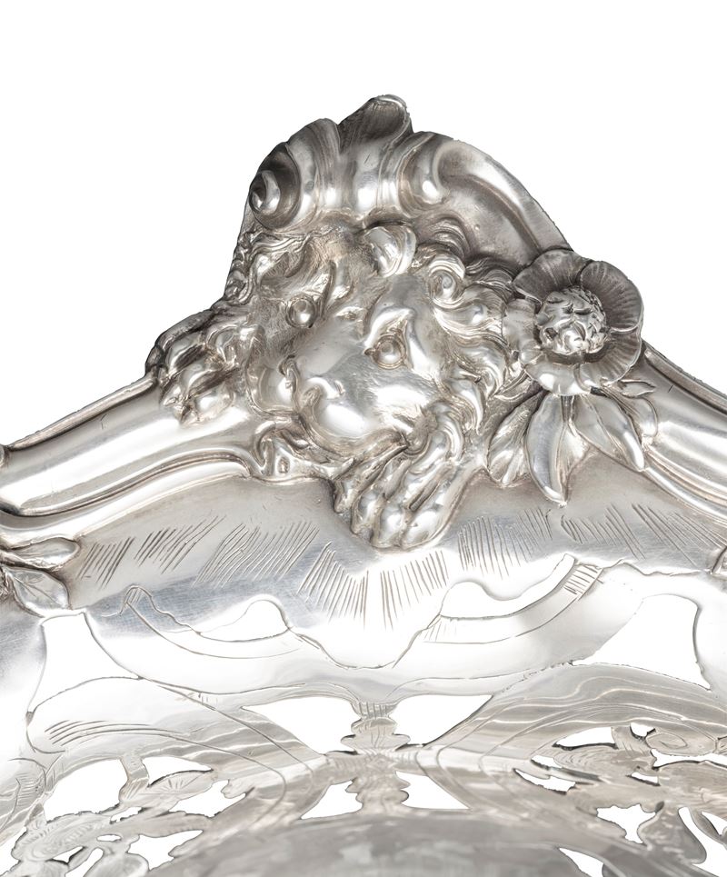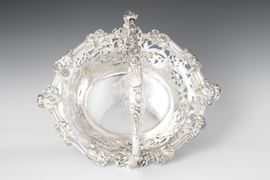 L'equilibrio stilistico ed estetico, oltre ai marchi presenti sul fondello, rimandano per la straordinaria qualità esecutiva all'opera del più importante maestro orafo operante in Inghilterra nella seconda metà del XVIII secolo, il celebre Paul de Lamerie. Nato nei Paesi Bassi, figlio di un nobile ugonotto francese, trasferitosi a Londra nel 1688, si formò nella bottega di Pierre Platel (1659-1739) aprendo una sua attività nel 1713 e in breve divenendo anche fornitore della corona e della corte inglese. La sua eccezionale abilità nel creare opere in uno stile rococò ricco di elaborati virtuosismi ed invenzioni nelle forme e di raffinate decorazioni cesellate lo fece conoscere anche oltremanica come testimoniano le opere eseguite per il re del Portogallo Giovanni V. Il nostro raro argento, eseguito in un abilissimo gioco di forme e di luci tra la leggerezza delle superfici traforate e finemente incise e la forza degli aggettanti volumi delle parti fuse e magistralmente cesellate in un tripudio di foglie, fiori, volute, conchiglie e figure zoomorfe trova riscontri stilistici con analoghe opere come i cestini conservati presso il Museum of Fine Art di Boston eseguito nel 1744 o con quello appartenente al The Clark Institute a Williamstown, Massachussetts datato 1745.