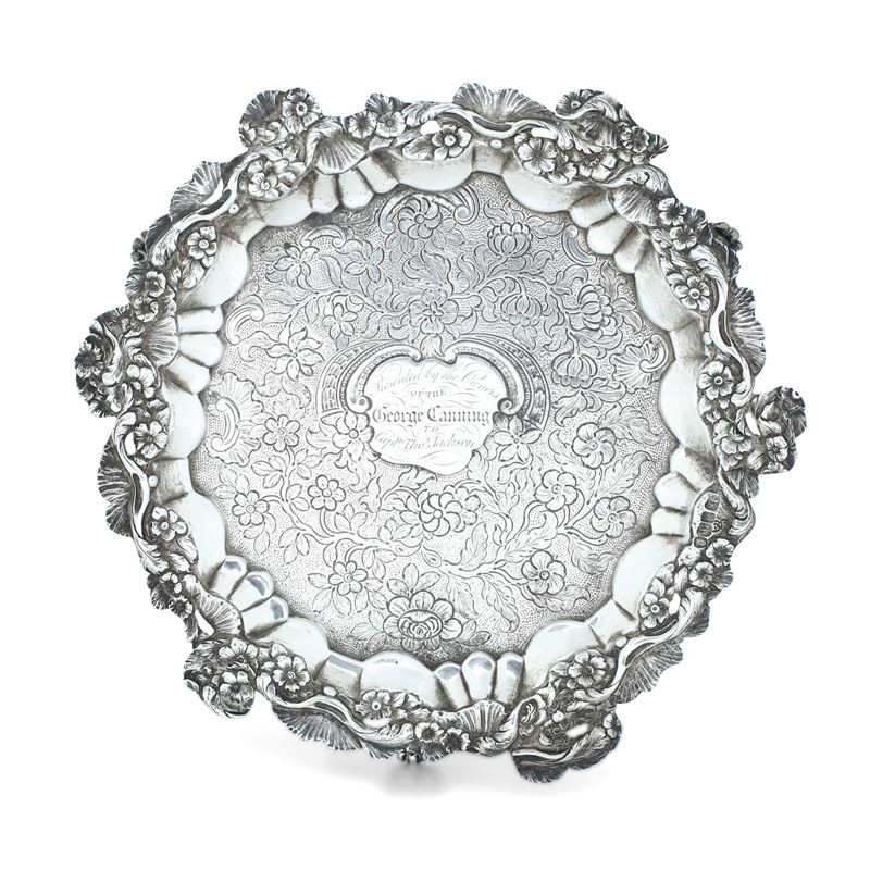 Londra 1819, marchio dell'argentiere parziale di difficile lettura (Edwall Farrell?) Salver