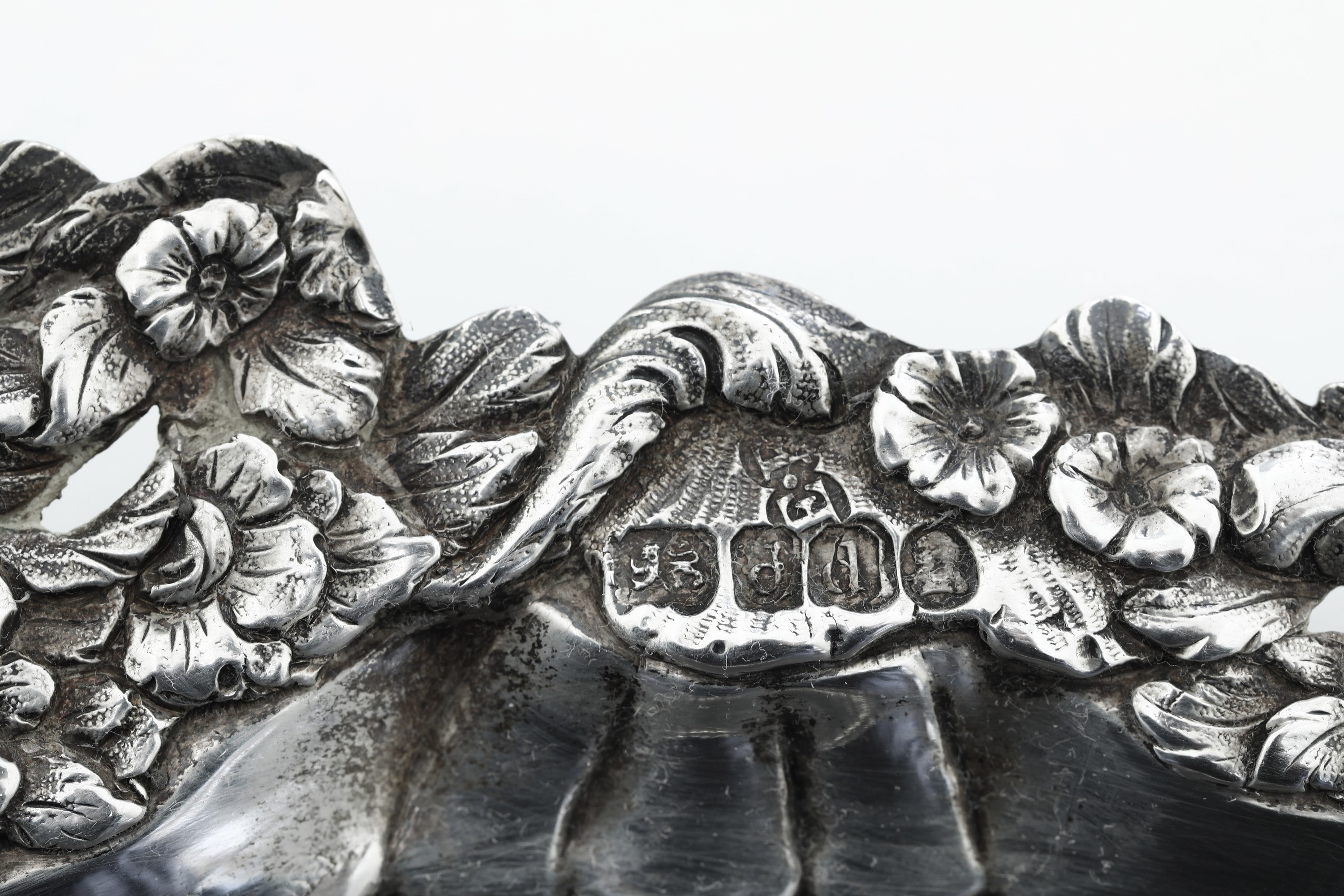 Bordo sagomato e ricchi decori floreali a fusione e cesello