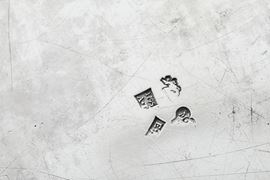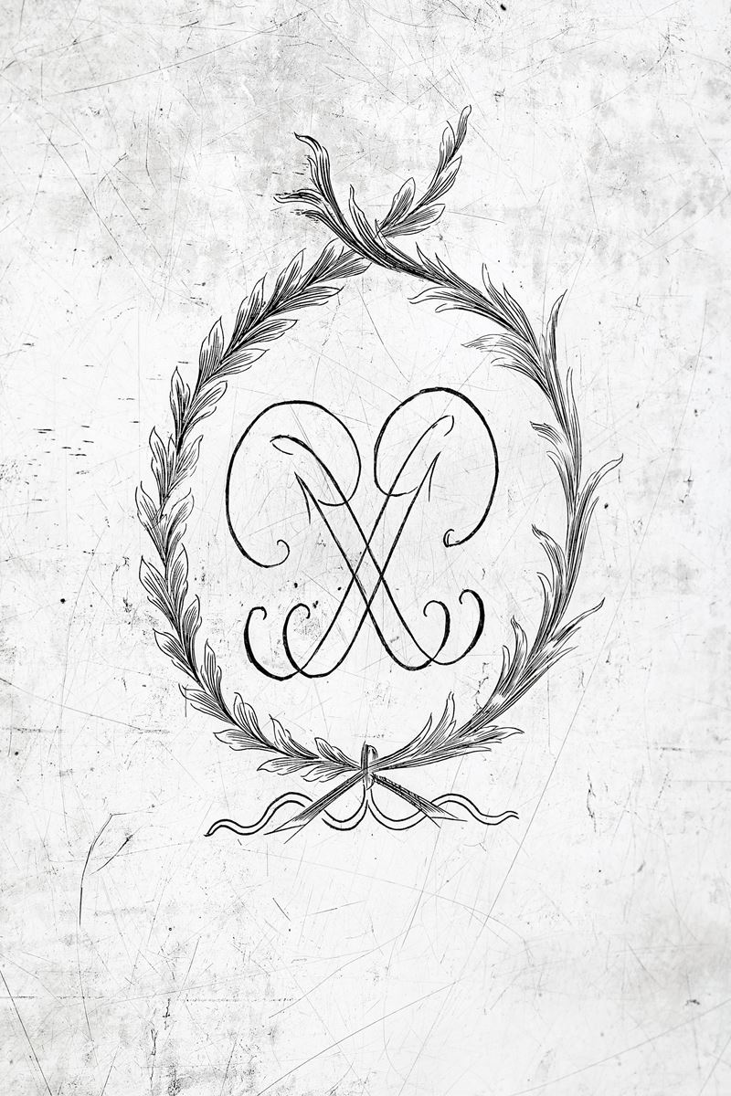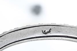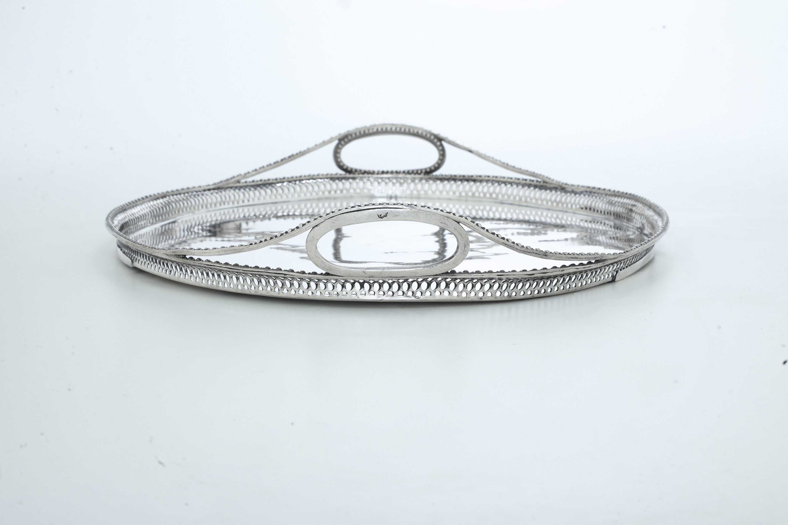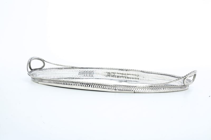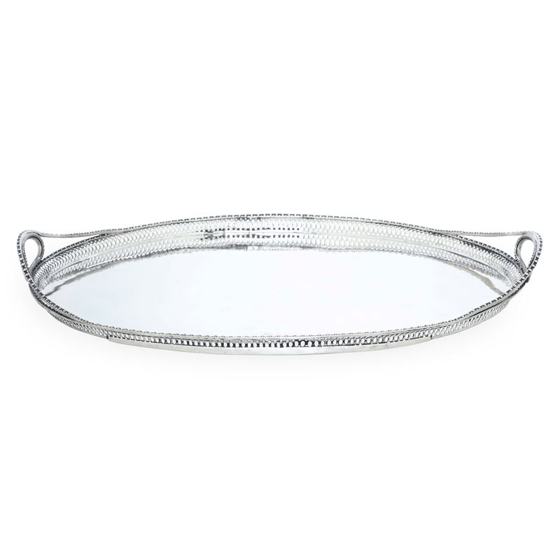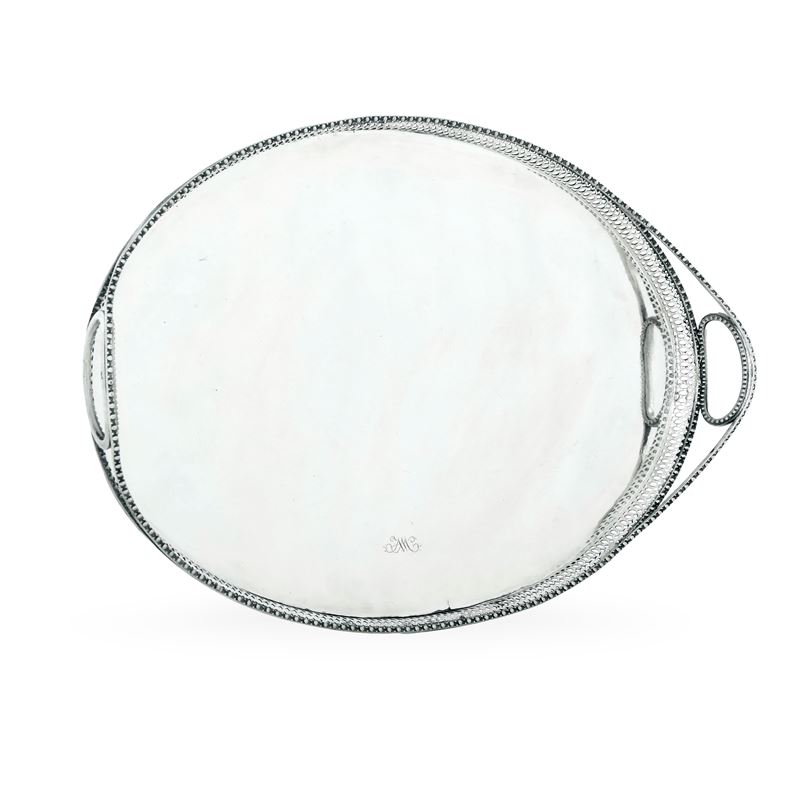 Forma ovale e bordo con eleganti decori a perlinature e traforo geometrico. Doppio monogramma inciso a cesello sul fronte, con doppia M o W e sul verso con due P intrecciate entro serto fogliato