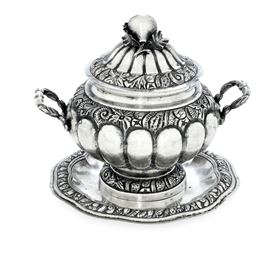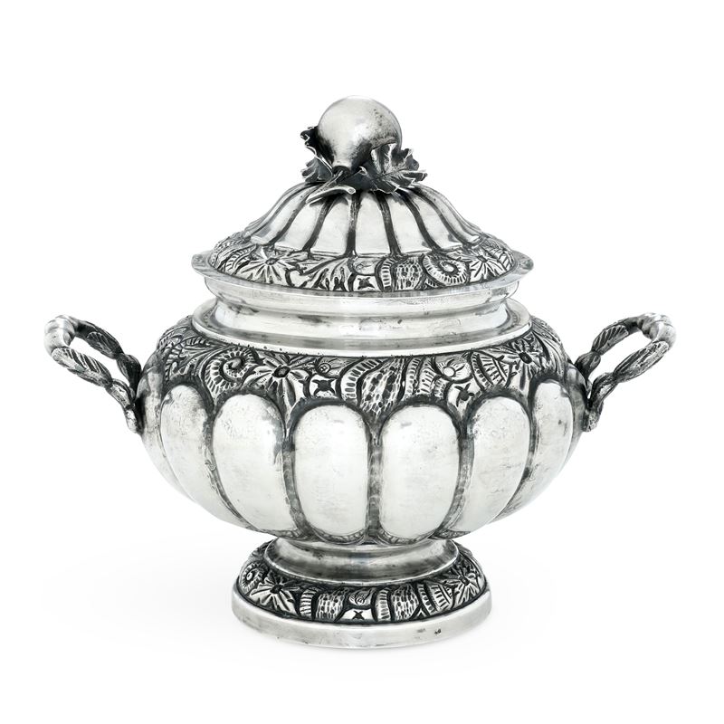 Corpo baccellato con decori a maruzzella e presa a foggia di frutto.