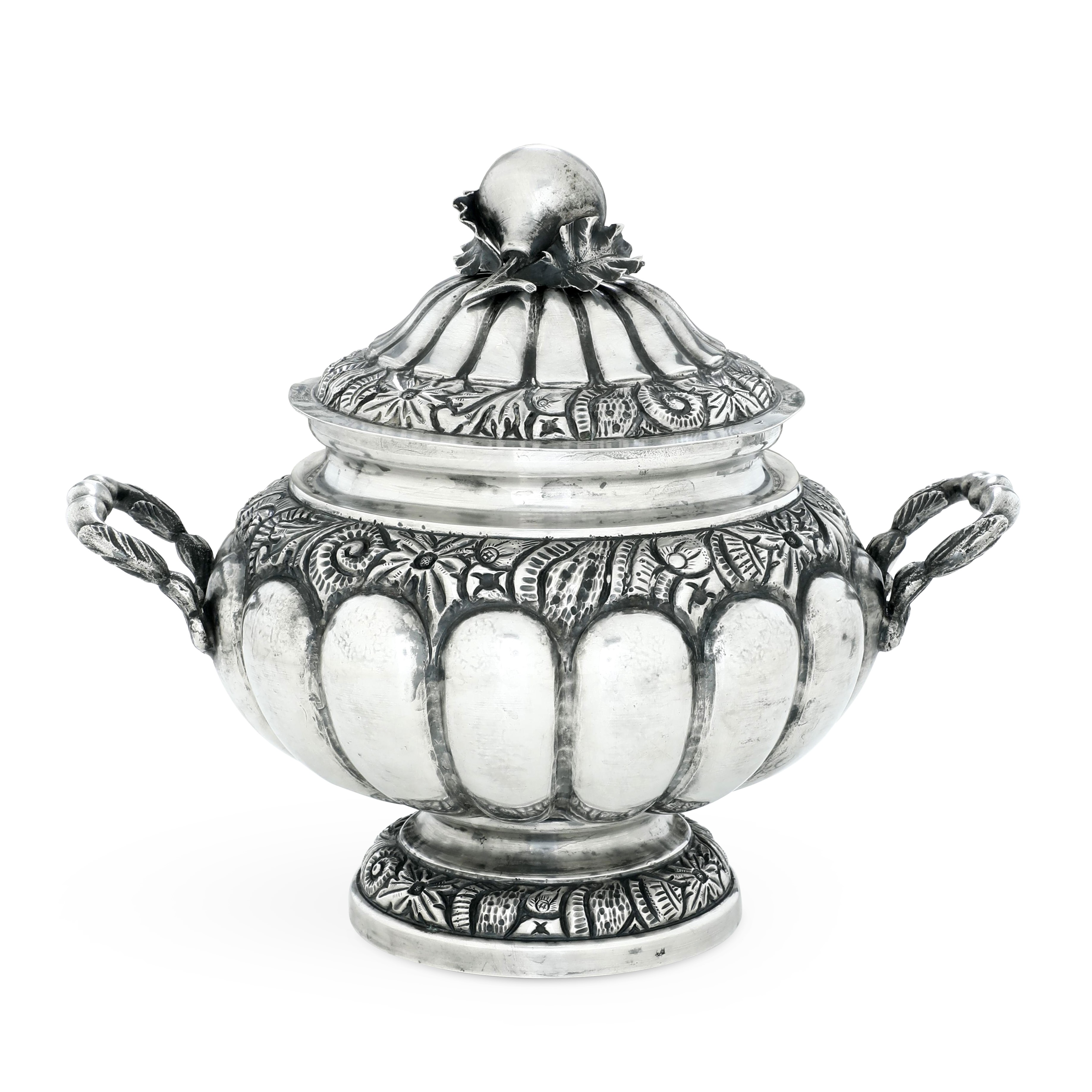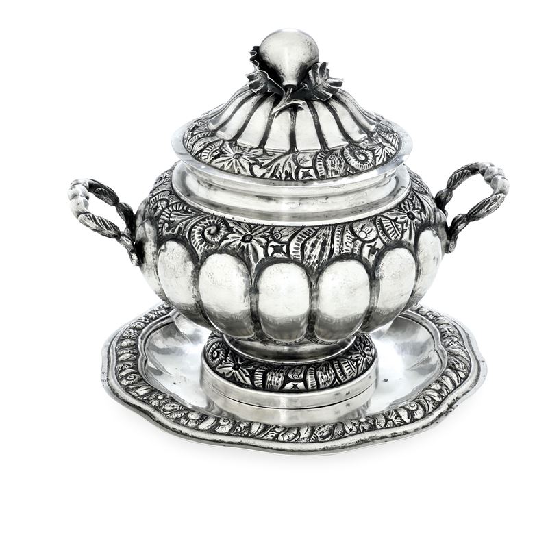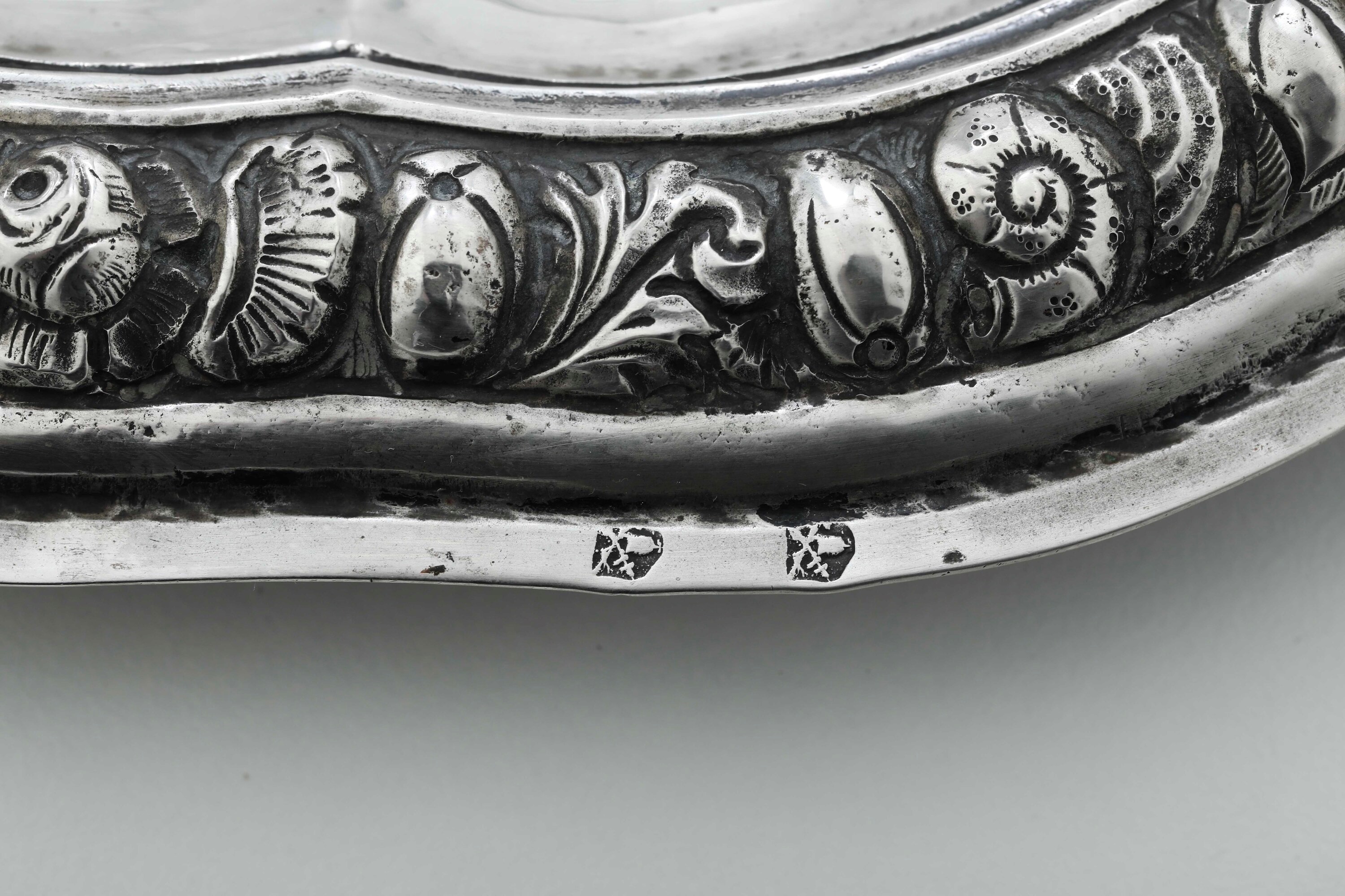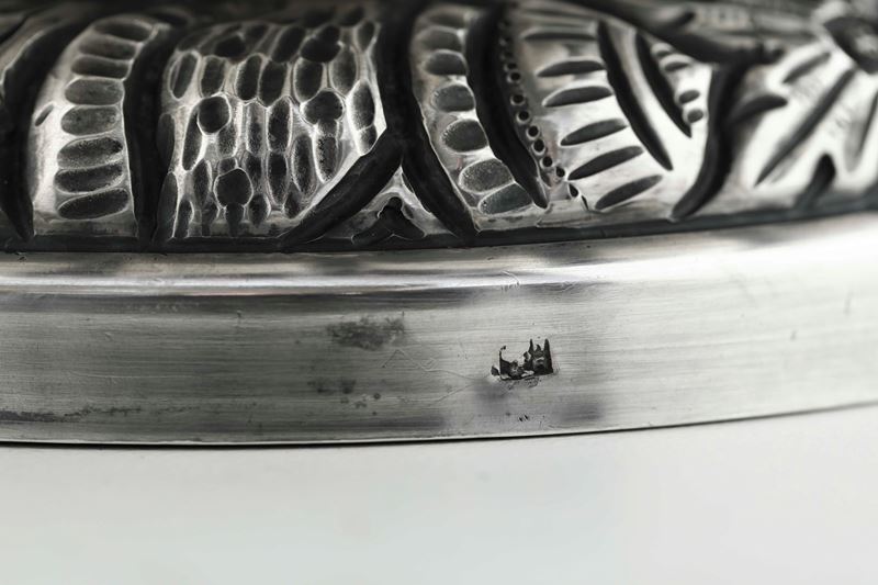 Nel lotto anche un piatto con analogo decoro punzonato con marchi ad imitazione dell'argenteria romana del XIX secolo, cm 26,5