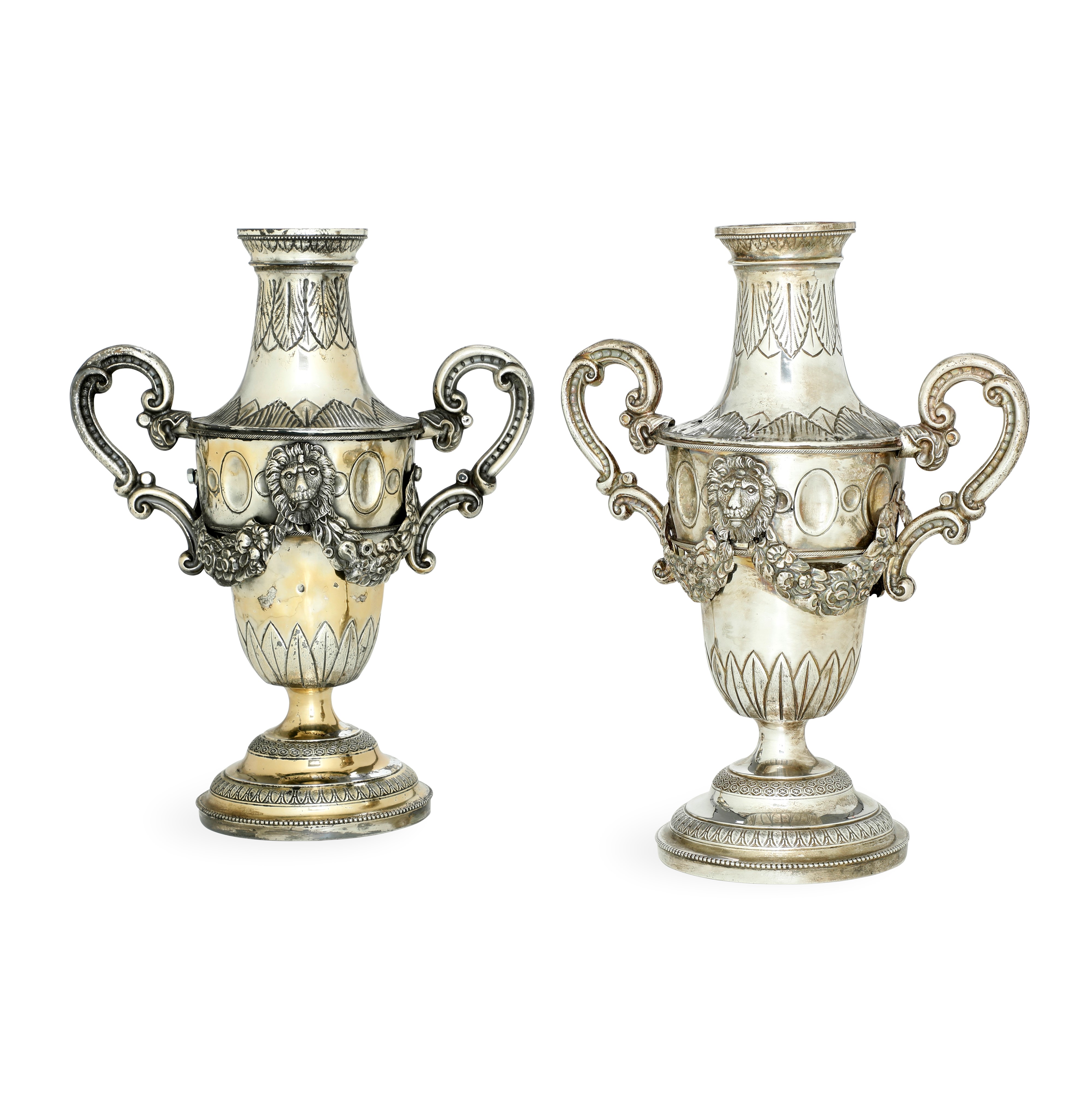 Corpo a foggia di anfora biansata con decori a foglie lanceolate e ovuli. Elegante decoro a festoni floreali e teste leonine di gusto neoclassico
