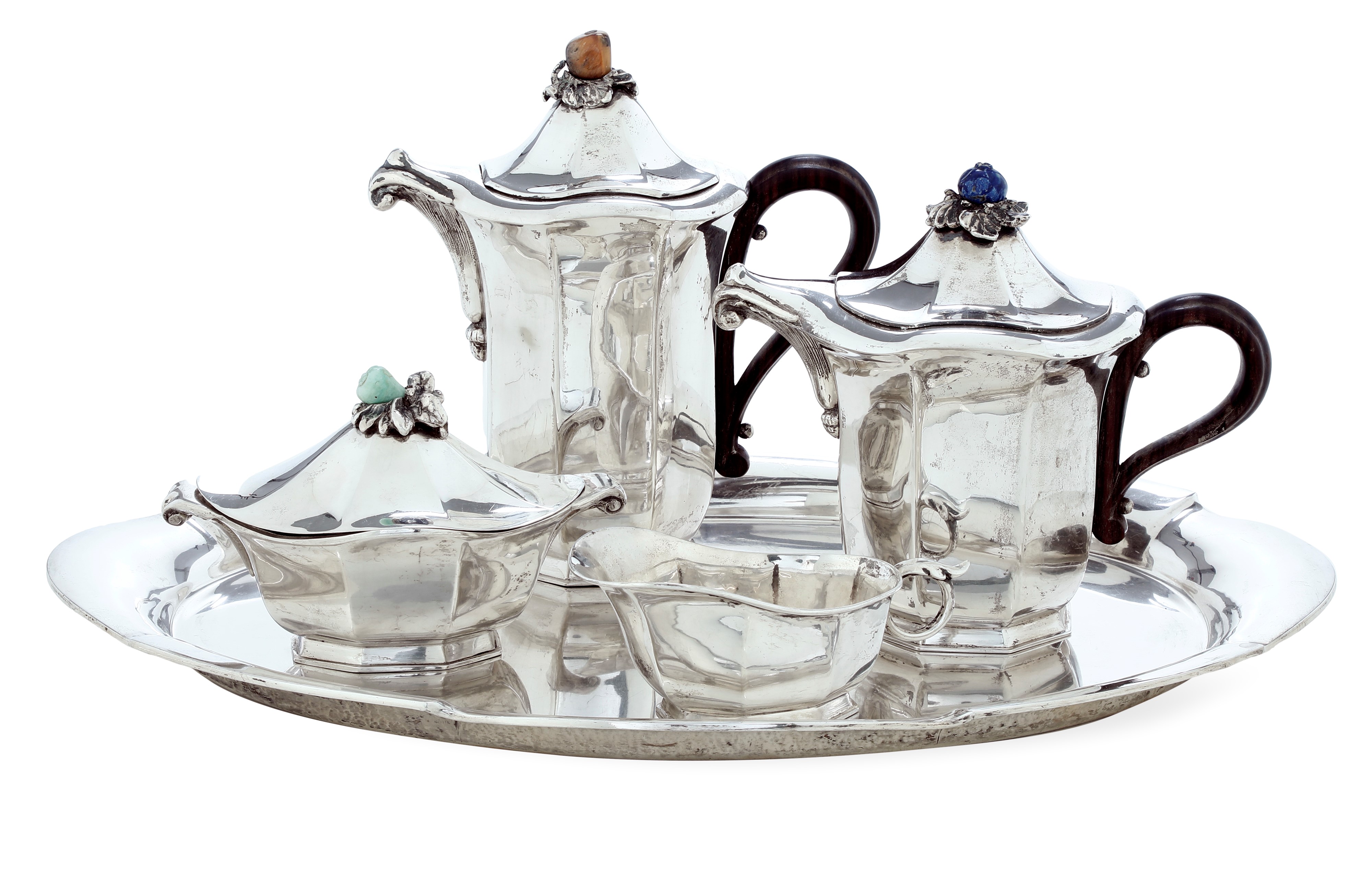 Argento fuso, sagomato, prese in pietre dure e manici in legno ebanizzato