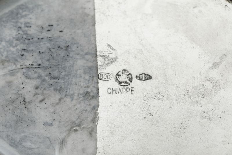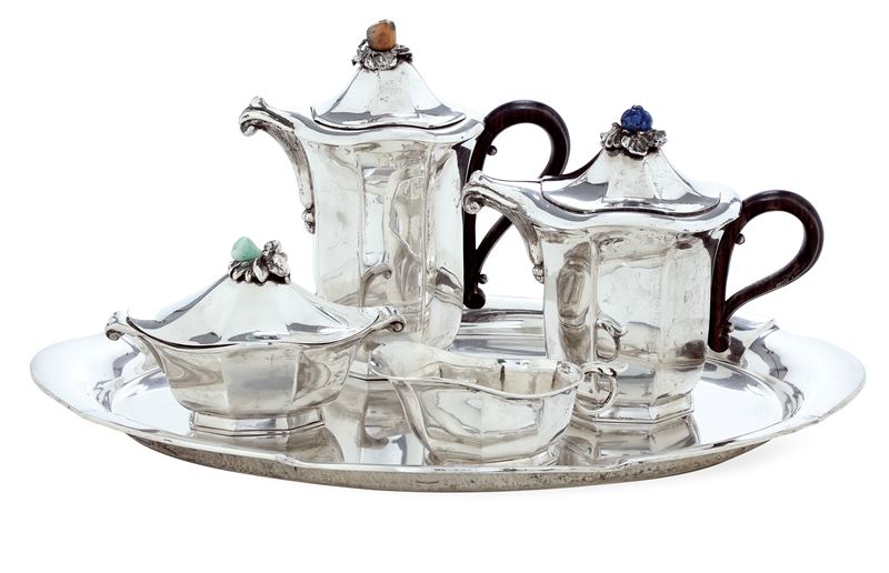 Argenteria artistica italiana, marchio con fascio littorio in uso dal 1935 al 1945, argentiere Messulam, Milano per gioielleria Chiappe, Genova Servito da tè e caffè