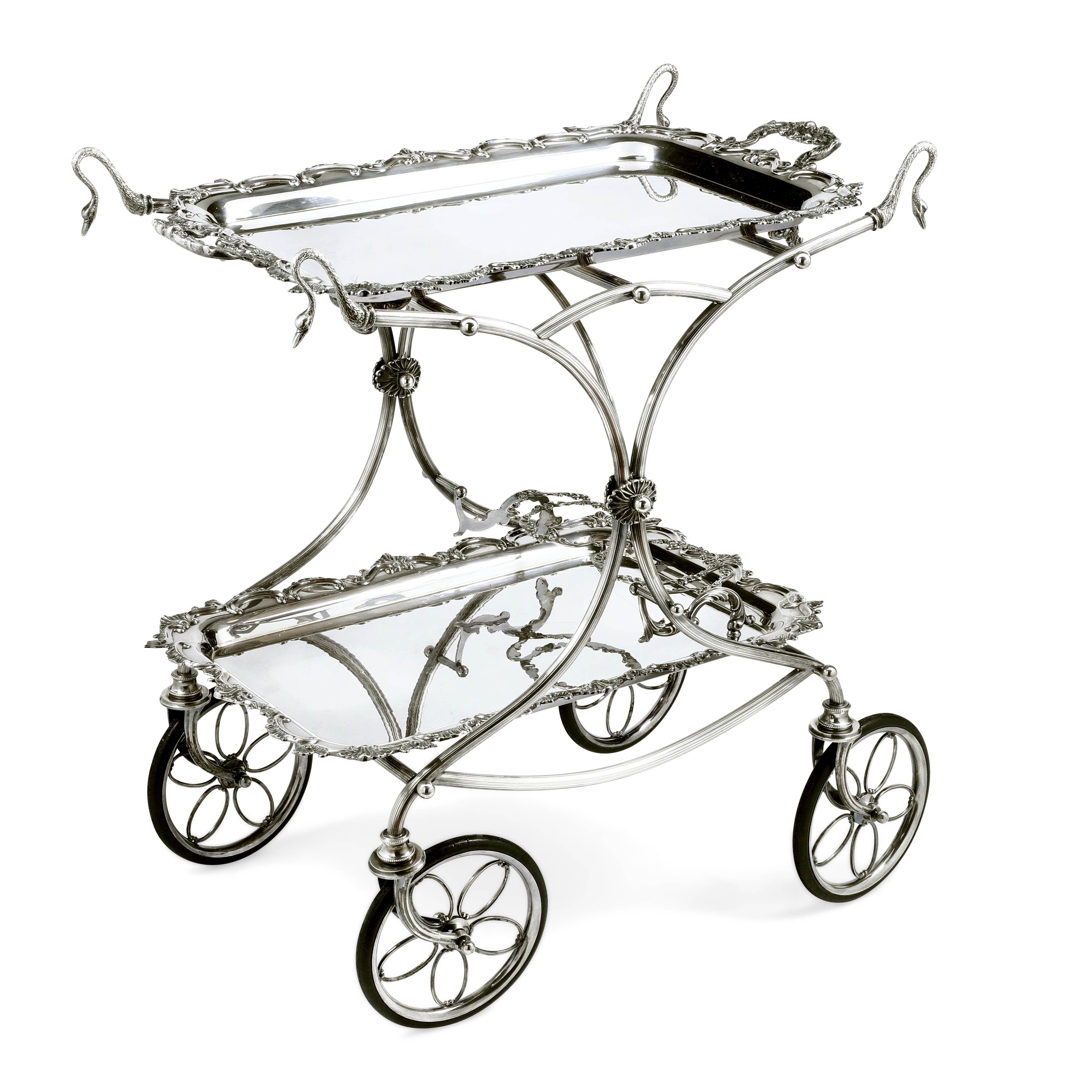 Struttura tubulare sagomata e nervata a due ripiani sovrapposti, ruote gommate a raggi ovoidali e maniglie a foggia di teste di cigno. Piani di appoggio composti da due grandi vassoi estraibili con bordo e prese laterali mistilinee decorati con motivi a volute e ventagli di gusto settecentesco
