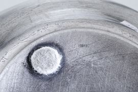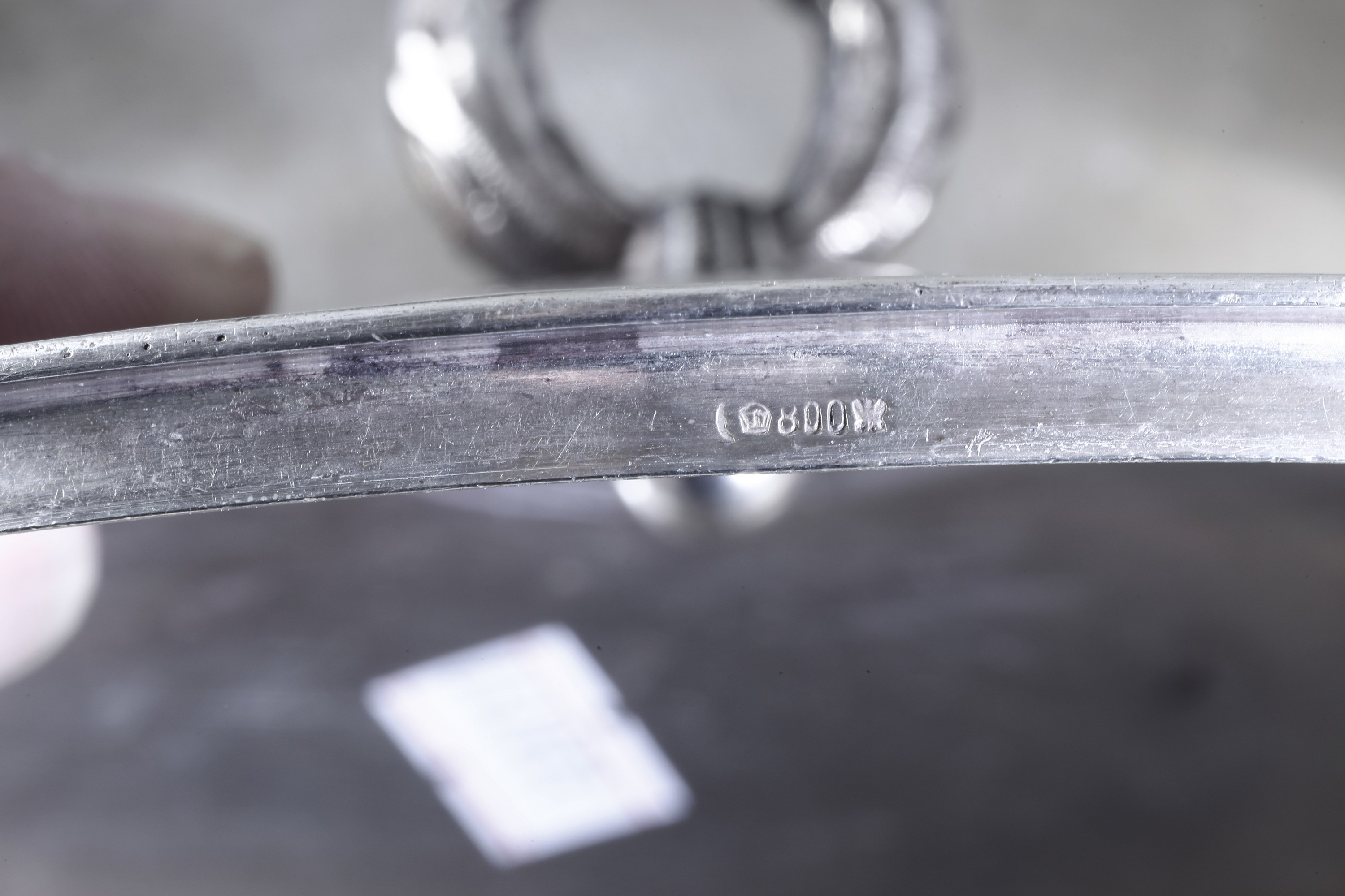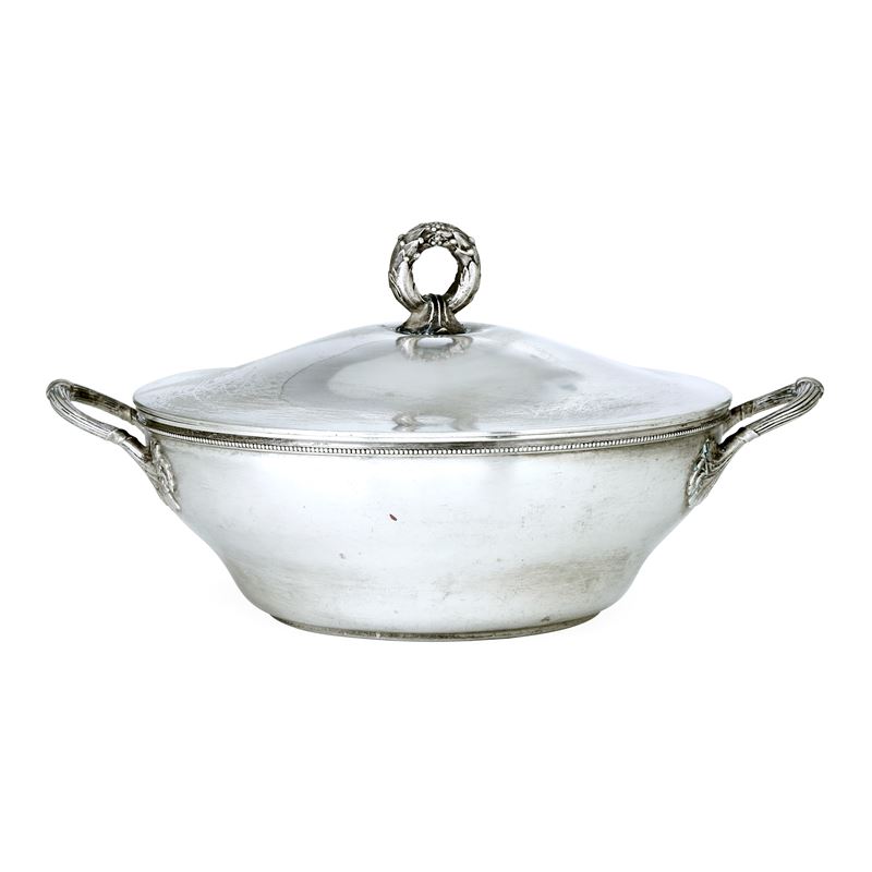 Eleganti decori di gusto neoclassico con perlinatura. Anse laterali a motivi fitomorfi e presa a ghirlanda