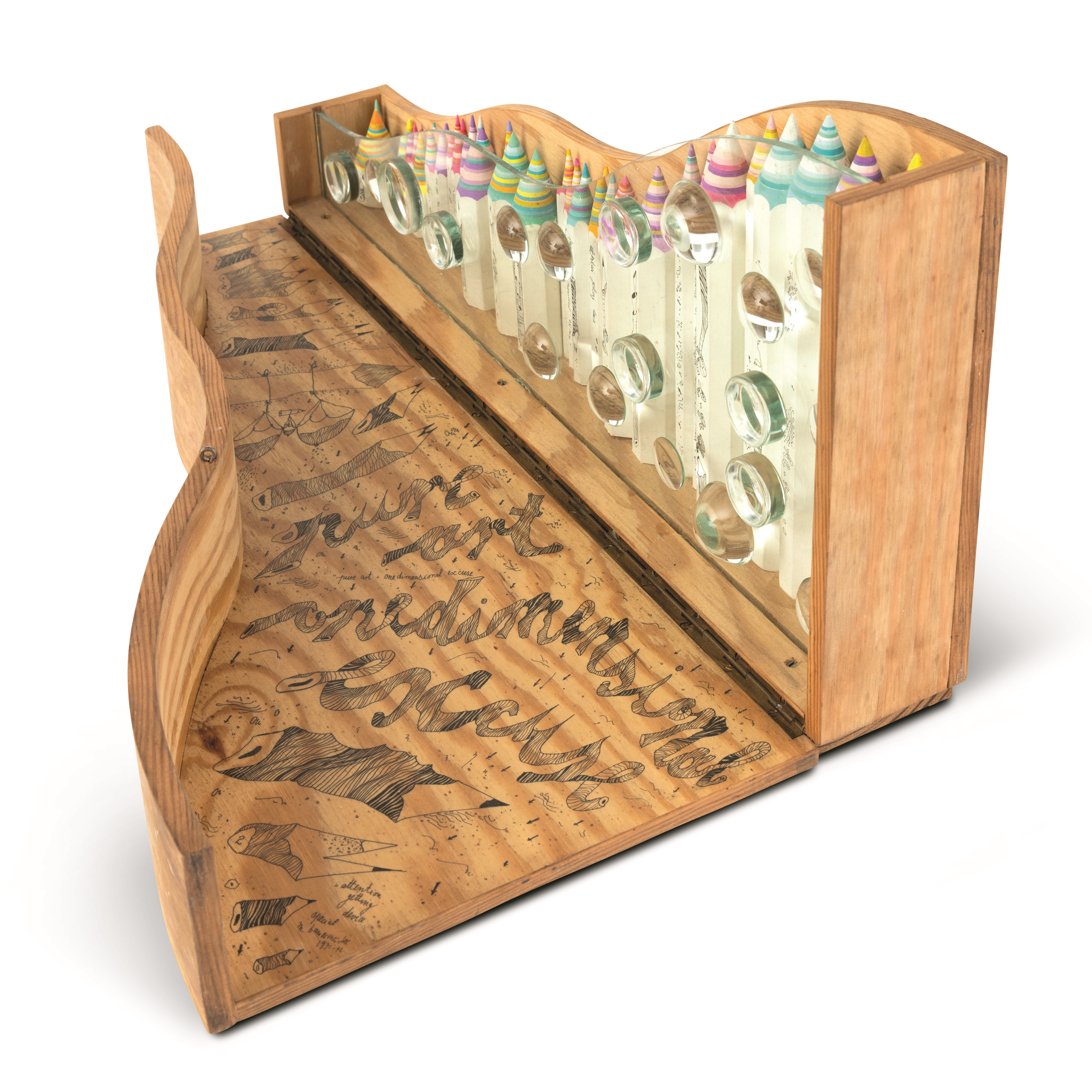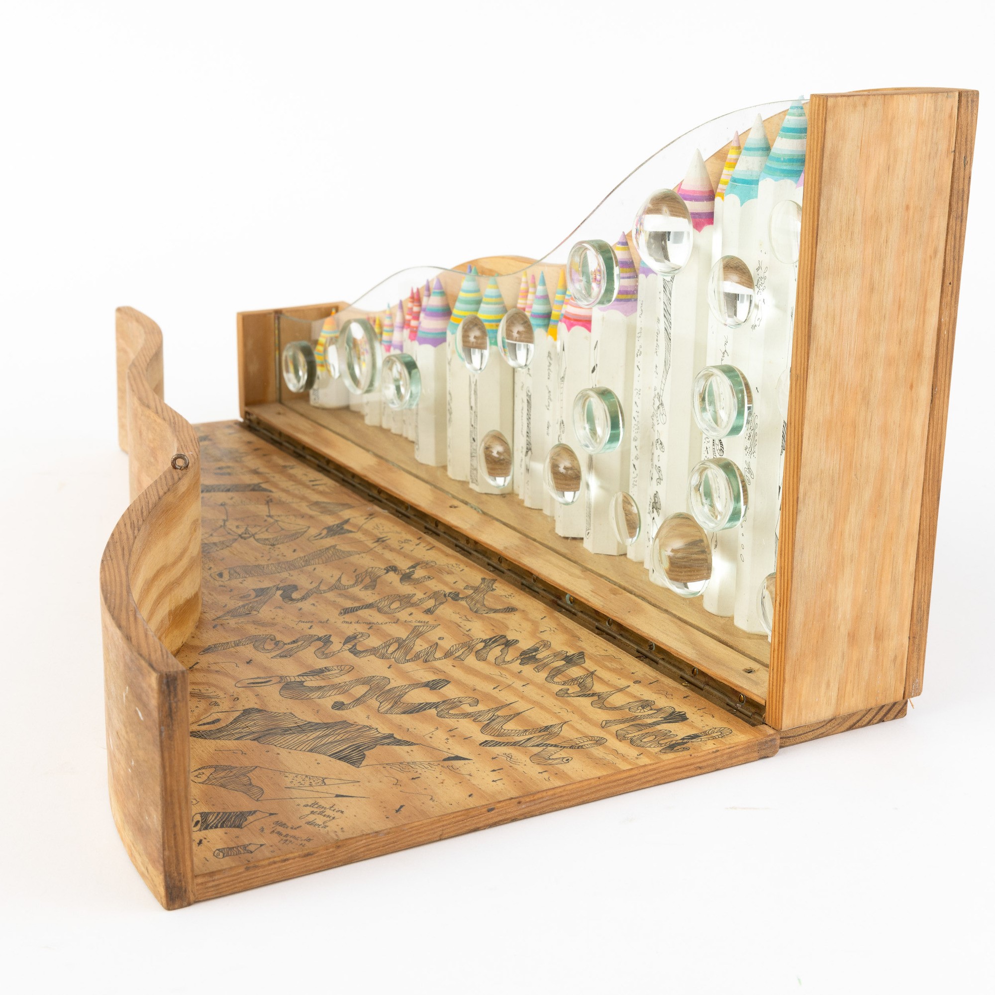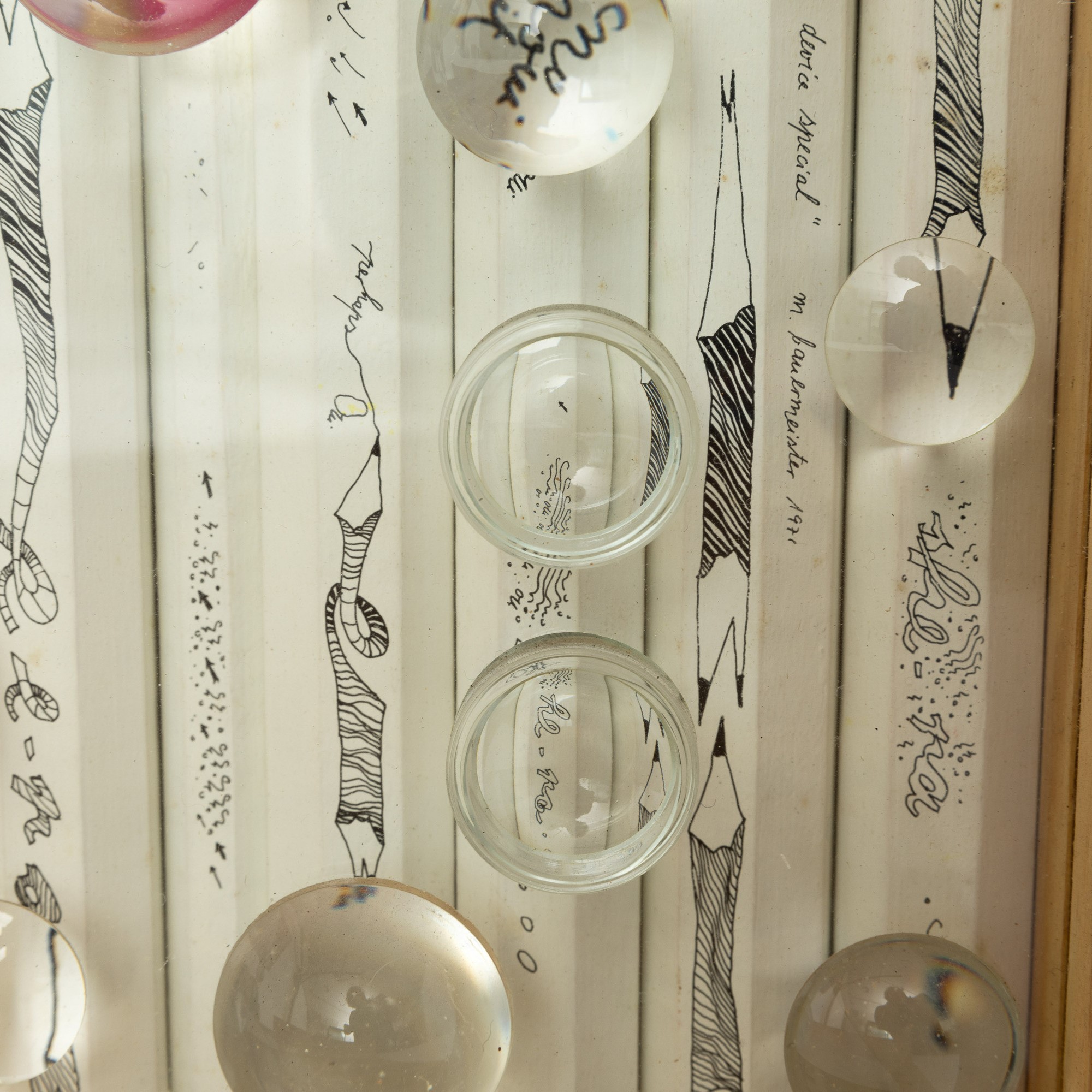 assemblaggio, legno sagomato e dipinto, vetro, lenti ottiche, inchiostro e pittura