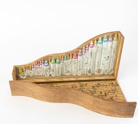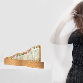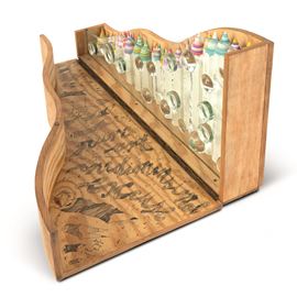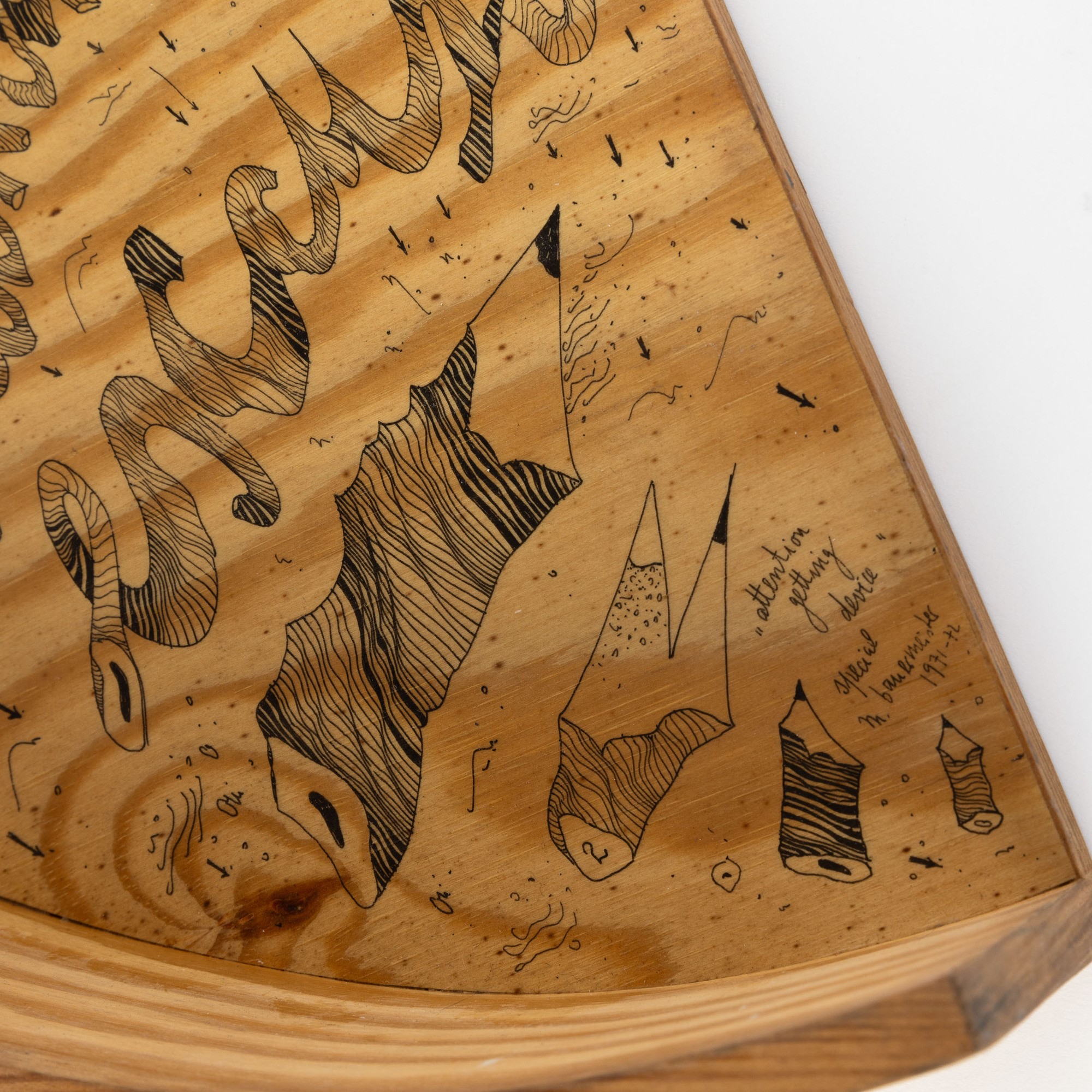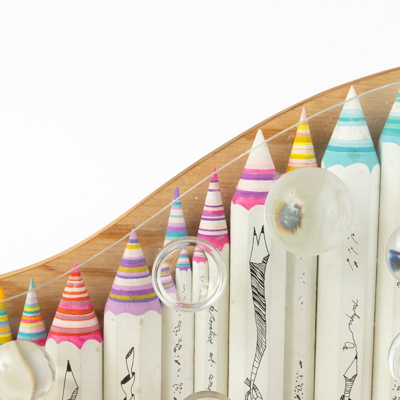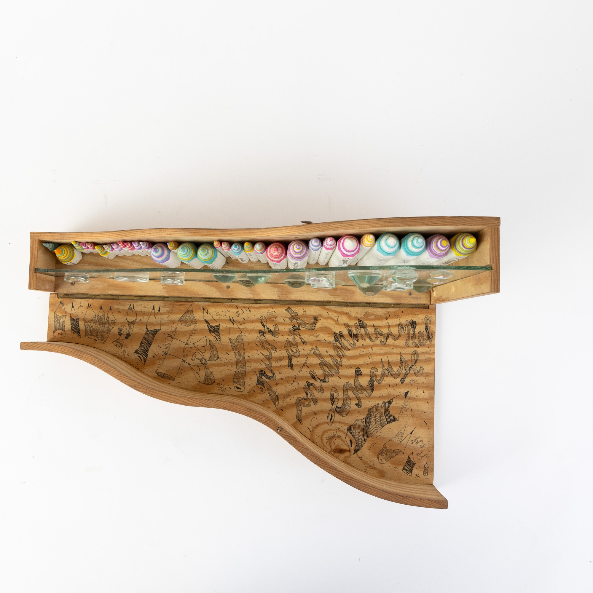 assemblaggio, legno sagomato e dipinto, vetro, lenti ottiche, inchiostro e pittura