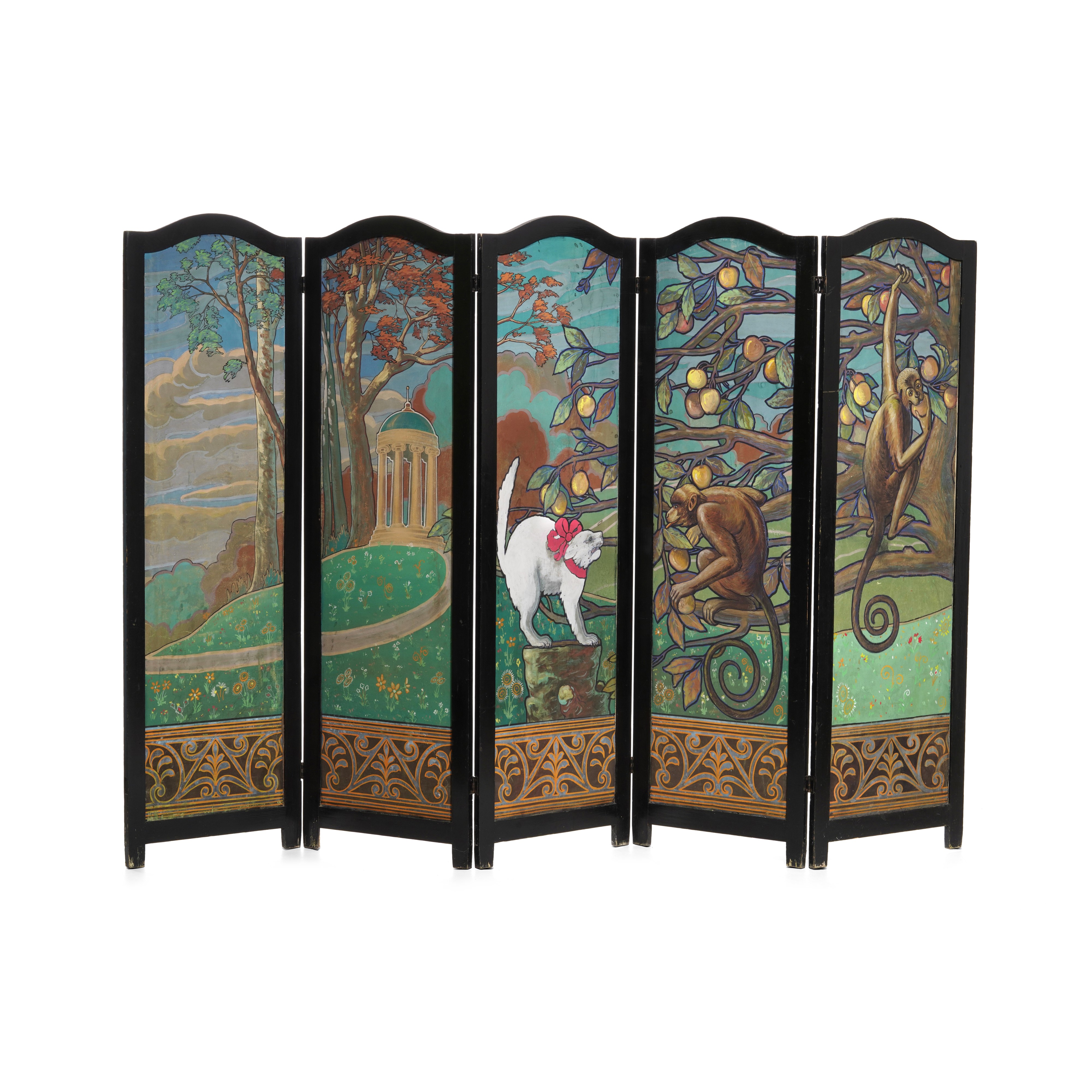 Paravento in legno ebanizzato dipinto in policromia con paesaggio con scimmie e gatto