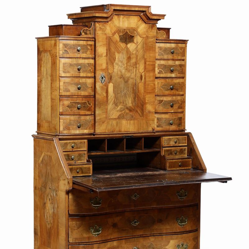 base con fronte mosso a tre cassetti, alzata con anta centrale e 10 cassetti