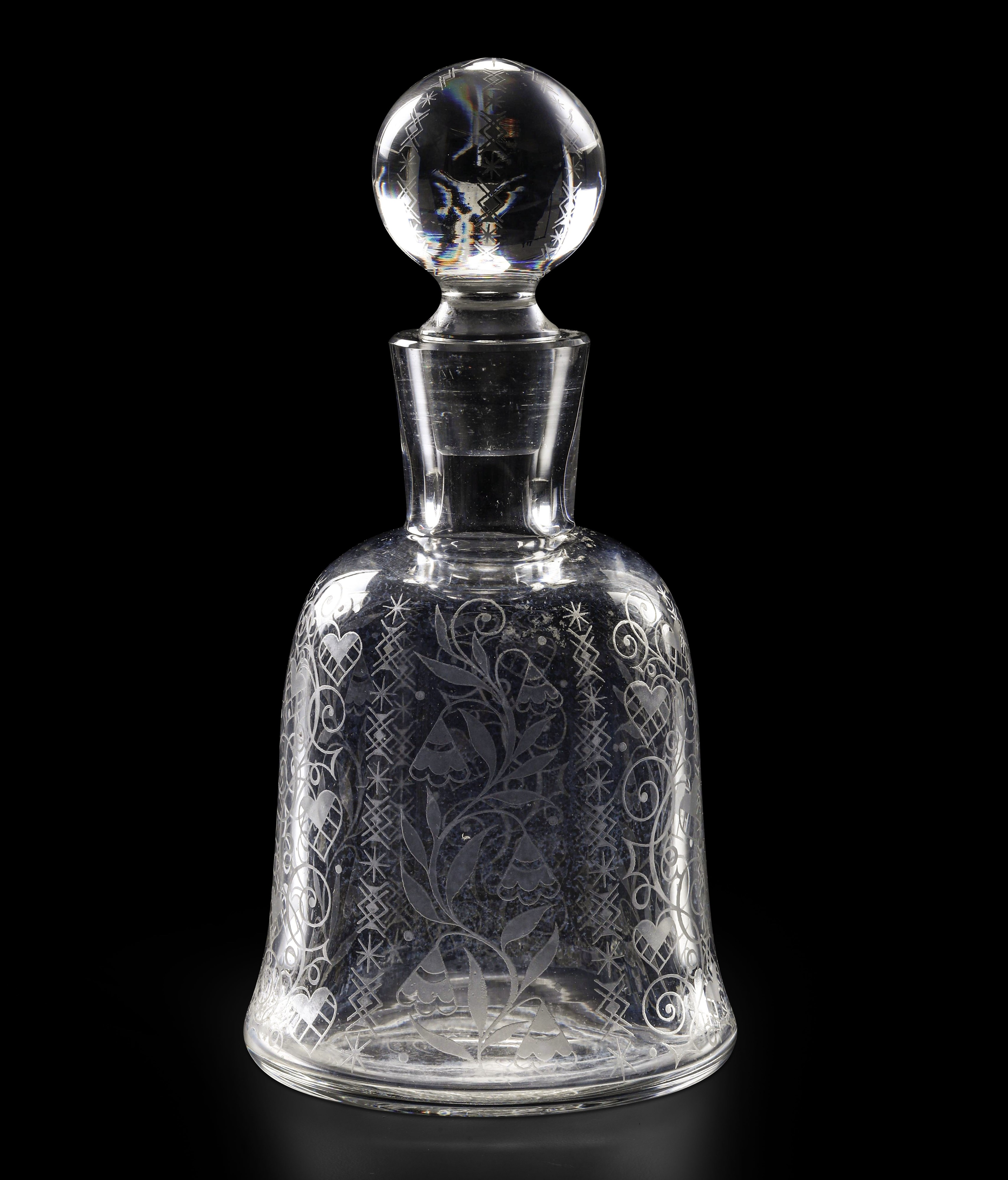 Questo modello di bottiglia decanter, dalla superficie incisa a motivi floreali e geometrici stilizzati, è stata prodotta dal 1943 al 1961