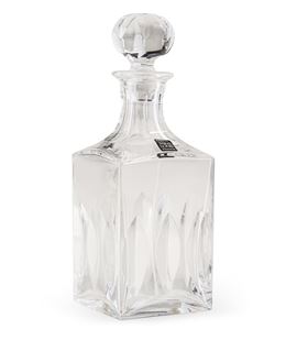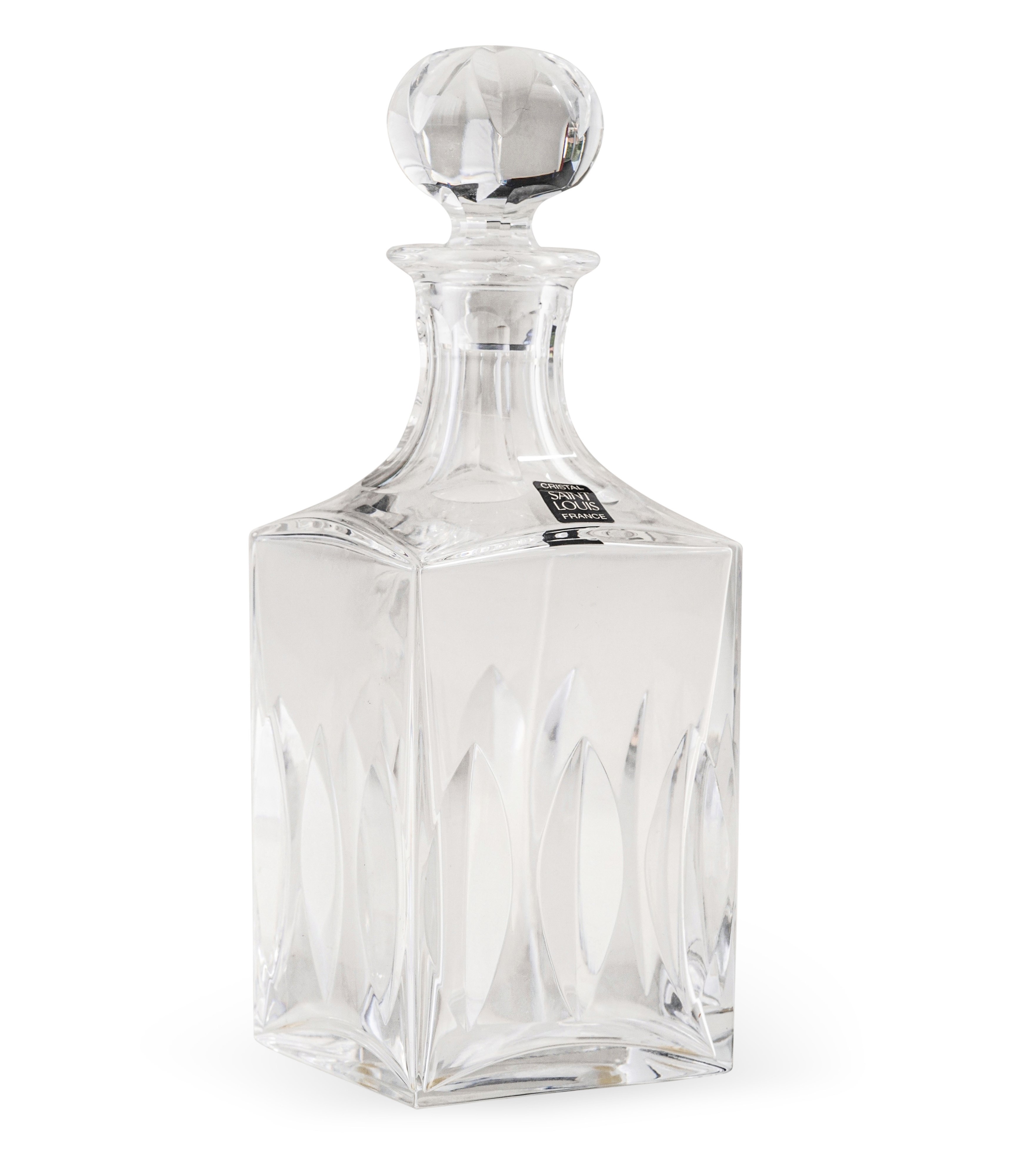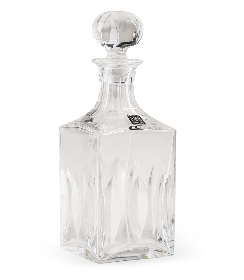 La bottiglia "Jersey" in cristallo trasparente dalla sezione quadrata presenta su ciascun lato una decorazione a molature geometriche con tagli verticali allungati simili a foglie. Questo tipo di bottiglia è utilizzato per servire liquori come whisky, cognac o armagnac