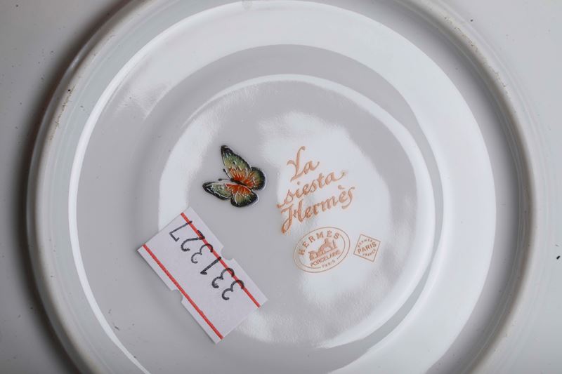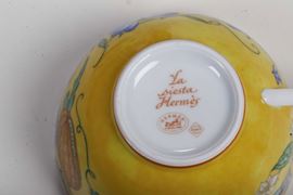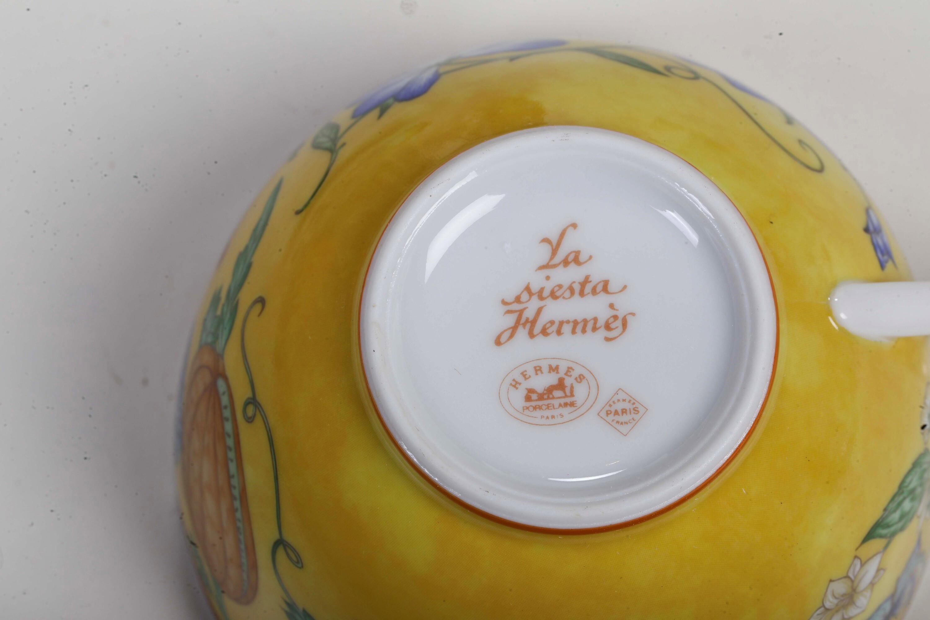 Porcellana. Marca: "La siesta Hermès"; simbolo grafico con "Hermès Porcelaine Paris" e "Hermès Paris France". Dimensioni: altezza tazza cm 5,5; diametro piattino cm 14,6. Conservazione: ottima. Scatola originale