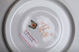 Le porcellane con il motivo "La Siesta" di Hermès è decorato con un motivo che ci immerge nell'affascinante bellezza di un giardino esotico, dove fiori, frutti, uccelli e farfalle danzano tra arabeschi su un fondo giallo, creando un'atmosfera estiva gioiosa