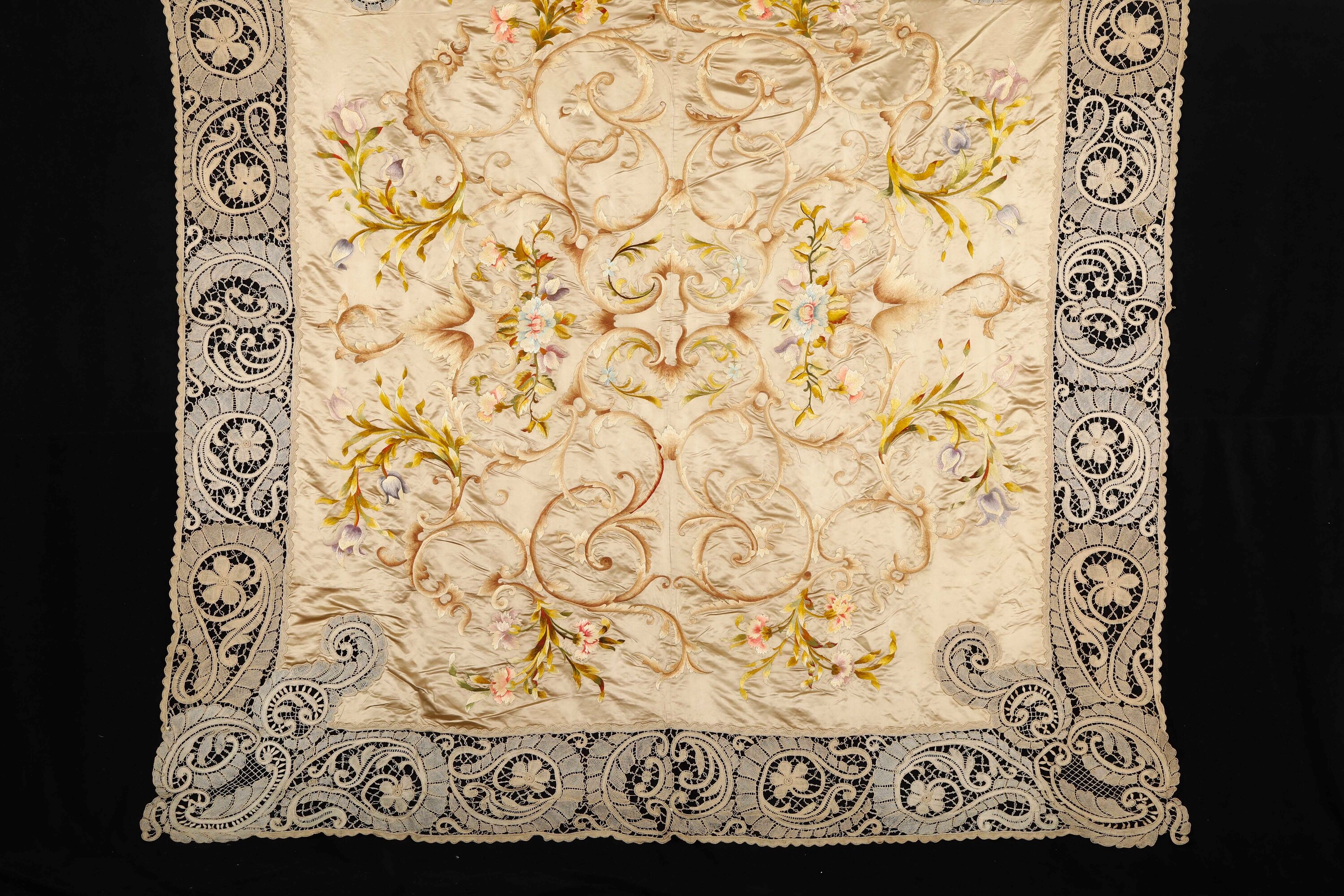 Tovaglia in seta color giallo dorato ricamata nella parte centrale da ramages con fiori e bordo in pizzo