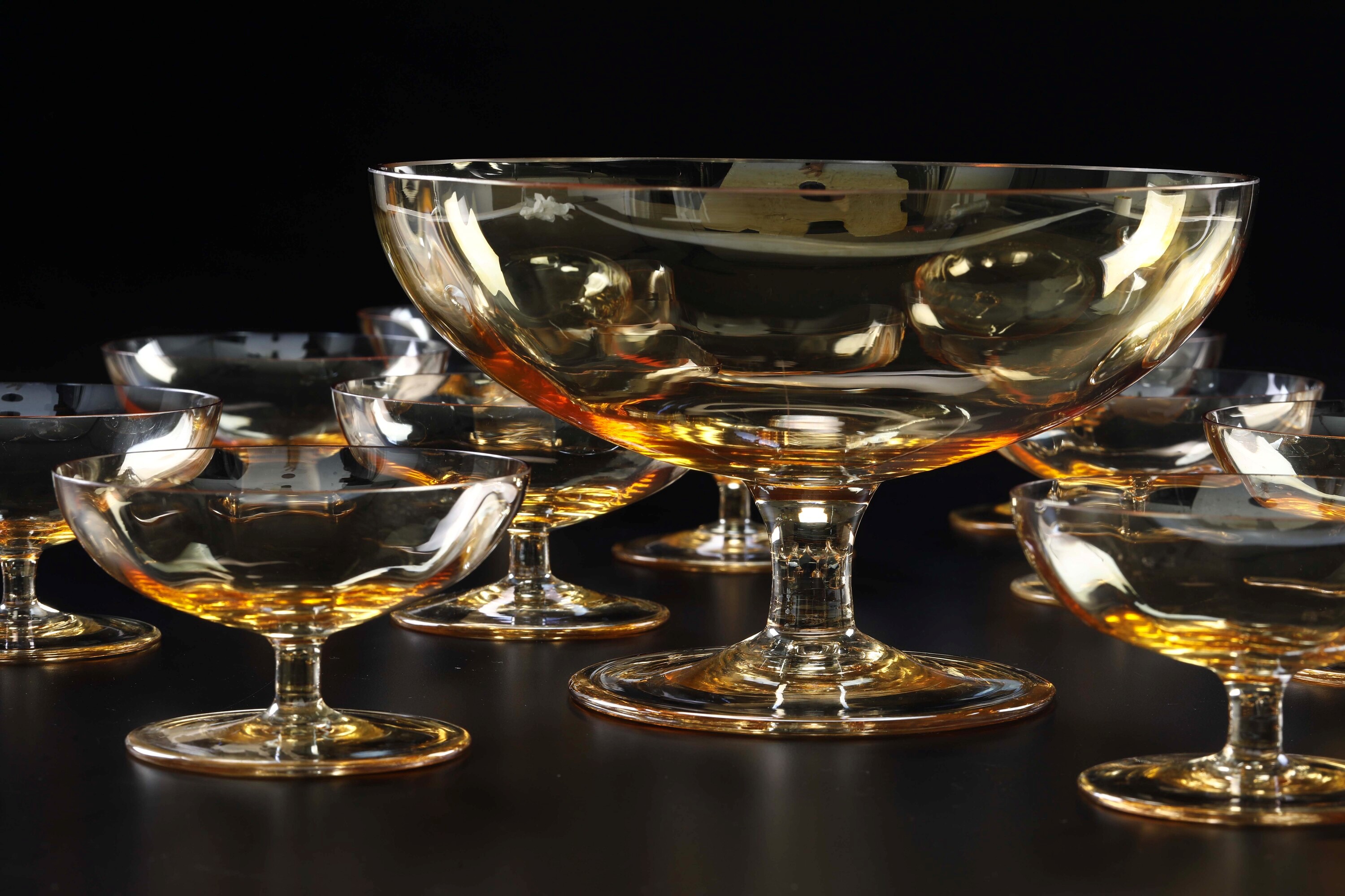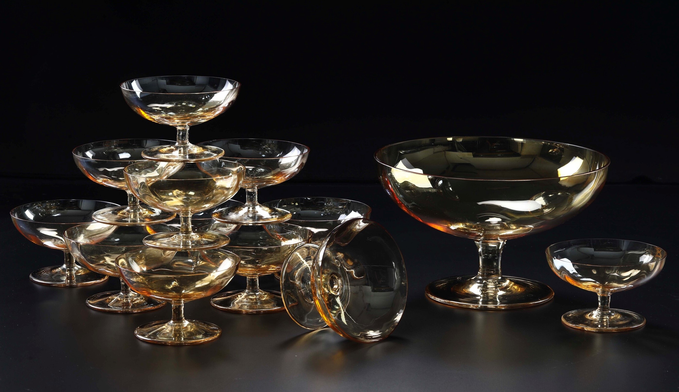 Vetro iridescente color ambra. Marca: assente. Dimensioni: coppette (altezza cm 7,5; diametro cm 11,5); coppa (altezza cm 15; diametro cm 24,5). Conservazione: ottima