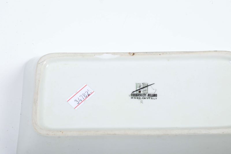 Terraglia con decoro serigrafato di verdure. Marca: simbolo grafico con “Fornasetti Milano”. Dimensioni: cm 20,5x10,8. Conservazione: ottima; 1 pezzo con seccatura al bordo d’appoggio