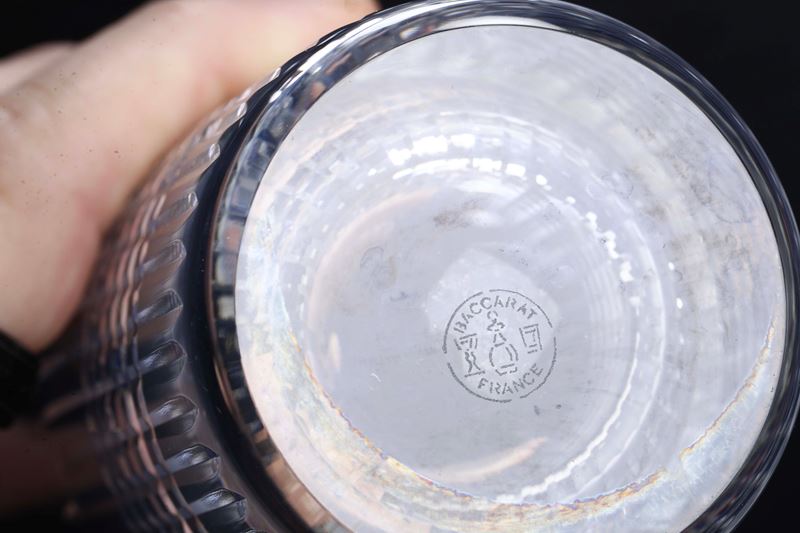 Cristallo. Marca: simbolo grafico con “Baccarat France” inciso all’acido. Altezza bicchiere cm 14; bottiglia cm 24,2. Conservazione: ottima