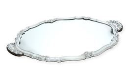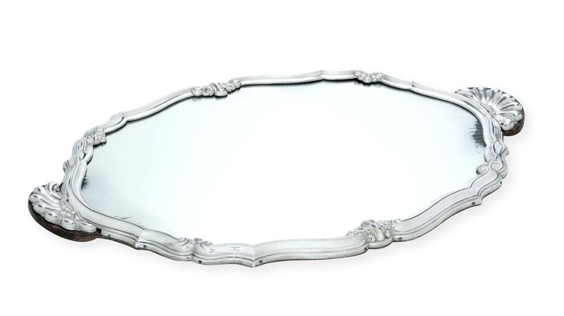 Présentoir a specchio con cornice mistilinea e anse a ventaglio. Argenteria italiana del XX secolo
