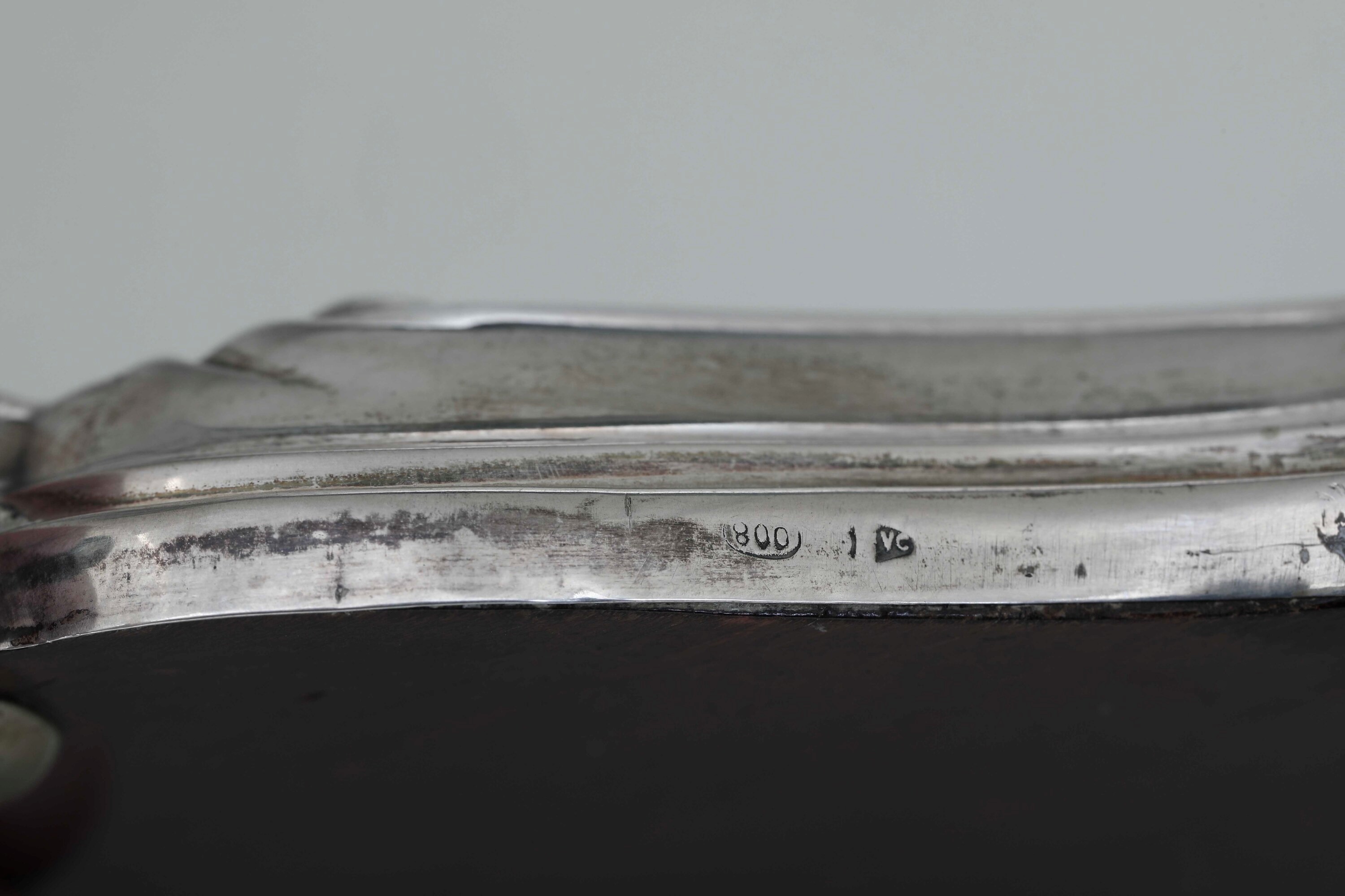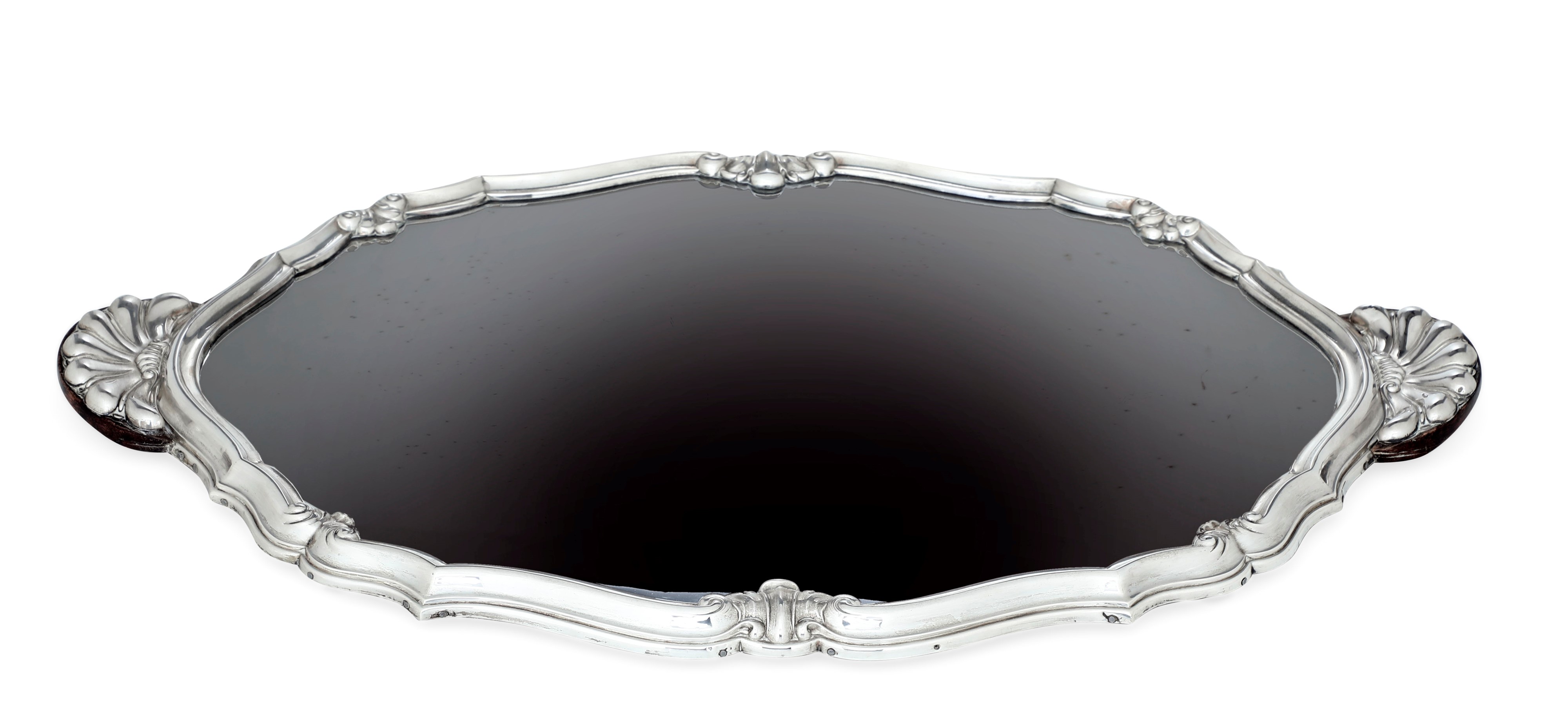 Présentoir a specchio. Cornice mistilinea con manici a ventaglio in argento. Argenteria artistica italiana. Marchi in uso dal 1935 al 1945. Argentiere Castaudi & Gautero, Vercelli