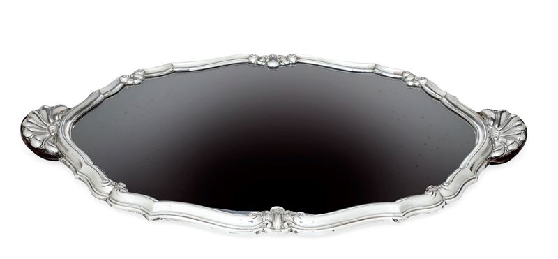 Présentoir a specchio. Cornice mistilinea con manici a ventaglio in argento. Argenteria artistica italiana. Marchi in uso [..]